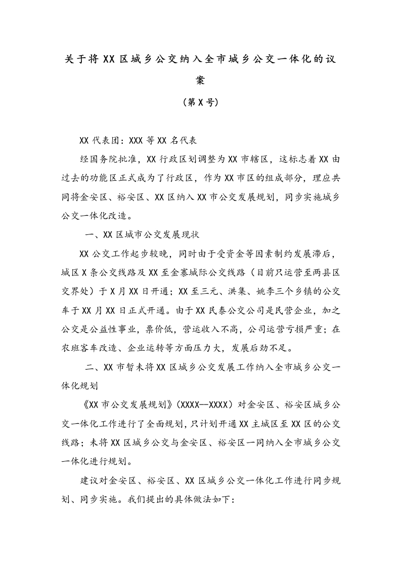 关于将XX区城乡公交纳入全市城乡公交一体化的议(第X号)X代表团:XX等X名代表经国务院批准,X行政区划调整为X市辖区,这标志着X由过去的功能区正式成为了行政区,作为X市区的组成部分,理应共同将金安区、裕安区、X区纳入X市公交发展规划,同步实施城乡公交一体化改造。一、X区城市公交发展现状X公交工作起步较晚,同时由于受资金等因素制约发展滞后,城区X条公交线路及X至金寨城际公交线路(目前只运营至两县区交界处)于X月X日开通;XX至三元、洪集、姚李三个乡镇的公交车于X月X日正式开通。由于X民泰公交公司是民营企业,加之公交是公益性事业,票价低,营运收入不高,公司运营亏损严重;在农班客车改造、企业运转等方面压力大,发展后劲不足。二、X市暂未将X区城乡公交发展工作纳入全市城乡公交一体化规划《XX市公交发展规划》(XXXX一XXX)对金安区、裕安区城乡公交一体化工作进行了全面规划,只计划开通X主城区至X区的公交线路;未将X区城乡公交与金安区、裕安区一同纳入全市城乡公交一体化进行规划。建议对金安区、裕安区、X区城乡公交一体化工作进行同步规划、同步实施。我们提出的具体做法如下:(一)、修订《XX市公交发展规划》(XXXX-一XXX),确保三区城乡公交一体化工作同步实施,方便广大群众出行。(二)、市级财政对城乡公交一体化发展工作予以资金支持。(三)、争取上级支持,促进公交事业健康发展,为全市城乡公交一体化发展提供保障与支持。免责声明:图文来源网络征集,版权归原作者所有。若侵犯了您的合法权益,请作者持权属证明与本站联系,我们将及时更正、副除!谢谢!