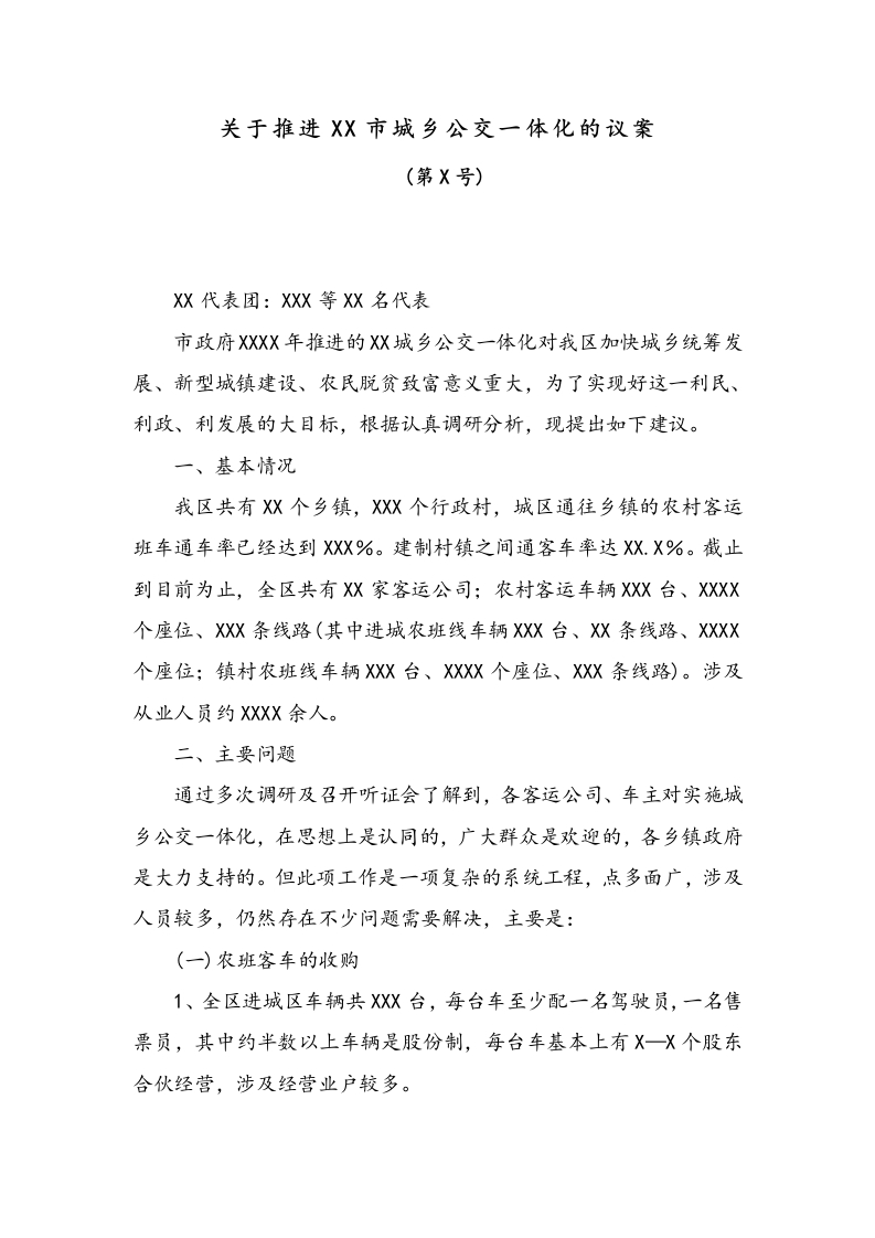 关于推进XX市城乡公交一体化的议案(第X号)市政府XXX年推进的X城乡公交一体化对我区加快城乡统筹发展、新型城镇建设、农民脱贫致富意义重大,为了实现好这一利民、利政、利发展的大目标,根据认真调研分析,现提出如下建议。一、基本情况我区共有X个乡镇,XX个行政村,城区通往乡镇的农村客运班车通车率已经达到XX%。建制村镇之间通客车率达XX.X%。截止到目前为止,全区共有X家客运公司:农村客运车辆XX台、XXX个座位、XXX条线路(其中进城农班线车辆XX台、X条线路、XXX个座位;镇村农班线车辆XX台、XXXX个座位、XXX条线路)。涉及从业人员约XXX余人。二、主要问题通过多次调研及召开听证会了解到,各客运公司、车主对实施城乡公交一体化,在思想上是认同的,广大群众是欢迎的,各乡镇政府是大力支持的。但此项工作是一项复杂的系统工程,点多面广,涉及人员较多,仍然存在不少问题需要解决,主要是:(一)农班客车的收购1、全区进城区车辆共XX台,每台车至少配一名驾驶员,一名售票员,其中约半数以上车辆是股份制,每台车基本上有X一X个股东合伙经营,涉及经营业户较多。2、车辆新旧状况不一。购车价格不一,导致收购价格难以统一。3、经营效益不同。不同班线,它的年经济效益是不一样的,悬殊较大,如X至毛坦厂班线,每辆每年收入约X万,有的班线每辆每年收入不到X万元,甚至只有几万元。给下步政府制定退出经营补偿金标准带来难题。4、农班车私有炒私卖现象。XXX年我区按要求对所有农班车的个体运输业户纳入公司化管理,但多年来每条农班线已形成了对线路经营权垄断行为,由此导致了车辆私炒私卖现象,且价格一路攀升。以X至毛坦厂线路为例,目前每辆车已炒至近X万元,远远高于车辆实际购买价,这给车辆的评估收购造成较大难度。(二)客运公司的生存一是目前农班车与客运公司是“挂靠”性质,二者是“皮”“毛”关系,农班车全部被收购,交出经营权,客运公司也随之面临关门。另外车辆在公司绝大部分为挂户经营,但在法律意义上,公司对这些客运车辆具有不可推卸的安全生产主体责任,我区有个别公司对本公司客车在营运中发生较大安全事故时,经法院依法判决,公司承担了一定的法律责任,赔偿了相应的费用;二是车辆的线路许可的经营权为公司,公司对经营客运车辆每年收取一定的管理费:三是个别客运公司有转让、合并行为,在转让和合并的同时,被转让和合并的公司收取了一定的转让费。所以我区各客运公司要求政府在实施城乡公交一体化中,给予公司一定的经济补偿。(三)从业人员安置。由于实施城乡公交客运一体化对所有的农班车要进行全面收购,会造成驾驶员、售票员失业。车辆股东断了经济来源,客运公司面临关门歌业,他们要求在新的公交公司驾驶和管理