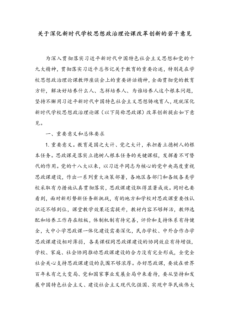关于深化新时代学校思想政治理论课改革创新的若干意见为深入贯彻落实习近平新时代中国特色社会主义思想和党的十九大精神,贯彻落实习近平总书记关于教育的重要论述,特别是在学校思想政治理论课教师座谈会上的重要讲话精神,全面贯彻党的教育方针,解决好培养什么人、怎样培养人、为谁培养人这个根本问题,坚持不懈用习近平新时代中国特色社会主义思想铸魂育人,现就深化新时代学校思想政治理论课(以下简称思政课)改革创新提出如下意见。一、重要意义和总体要求1.重要意义。教育是国之大计、党之大计,承担着立德树人的根本任务。思政课是落实立德树人根本任务的关键课程,发挥着不可替代的作用。党的十八大以来,以习近平同志为核心的党中央高度重视思政课建设,作出一系列重大决策部署,各地区各部门和各级各类学校采取有力措施认真贯彻落实,思政课建设取得显著成效。同时也要看到,面对新形势新任务新挑战,有的地方和学校对思政课重要性认识还不够到位,课堂教学效果还需提升,救材内容不够鲜活,教师选配和培养工作存在短板,体制机制有待完善,评价和支持体系有待健全,大中小学思政课一体化建设需要深化,民办学校、中外合作办学思政课建设相对薄弱,各类课程同思政课建设的协同效应有待增强,学校、家庭、社会协同推动思政课建设的合力没有完全形成,全党全社会关心支持思政课建设的氛围不够浓厚。办好思政课,要放在世界百年未有之大变局、党和国家事业发展全局中来看待,要从坚持和发展中国特色社会主义、建设社会主义现代化强国、实现中华民族伟大复兴的高度来对待。思政课建设只能加强、不能削弱,必须切实增强办好思政课的信心,全面提高思政课质量和水平。2.指导思想。全面贯彻党的教育方针,坚持马克思主义指导地位,贯彻落实习近平新时代中国特色社会主义思想,坚持社会主义办学方向,落实立德树人根本任务,坚持教育为人民服务、为中国共产党治国理政服务、为巩固和发展中国特色社会主义制度服务、为改革开放和社会主义现代化建设服务,扎根中国大地办教育,同生产劳动和社会实践相结合,加快推进教育现代化、建设教育强国、办好人民满意的教育,努力培养担当民族复兴大任的时代新人,培养德智体美劳全面发展的社会主义建设者和接班人。3.基本原则。一是坚持党对思政课建设的全面领导,把加强和改进思政课建设摆在突出位置。二是坚持思政课建设与党的创新理论武装同步推进,全面推动习近平新时代中国特色社会主义思想进教材进课堂进学生头脑,把社会主义核心价值观贯穿国民教育全过程。三是坚持守正和创新相统一,落实新时代思政课玫革创新要求,不断增强思政课的思想性、理论性和亲和力、针对性。四是坚持思政课在课程体系中的政治引领和价值引领作用,统筹大中小学思政课一体化建设,推动各类课程与思政课建设形成协同效应。五是坚持培养高素质专业化思政课教师队伍,积极为这支队伍成长发展搭建平台、创造条件。六是坚持问题导向和目标导向相结合,注重推动思政课建设内涵式发展,全面提升学生思想政治理论素养,实现知、情、意、行的统一。二、完善思政课课程教材体系4.整体规划思政课课程目标。在大中小学循序渐进、螺旋上升地开设思政课,引导学生立德成人、立志成才,树立正确世界观、人生