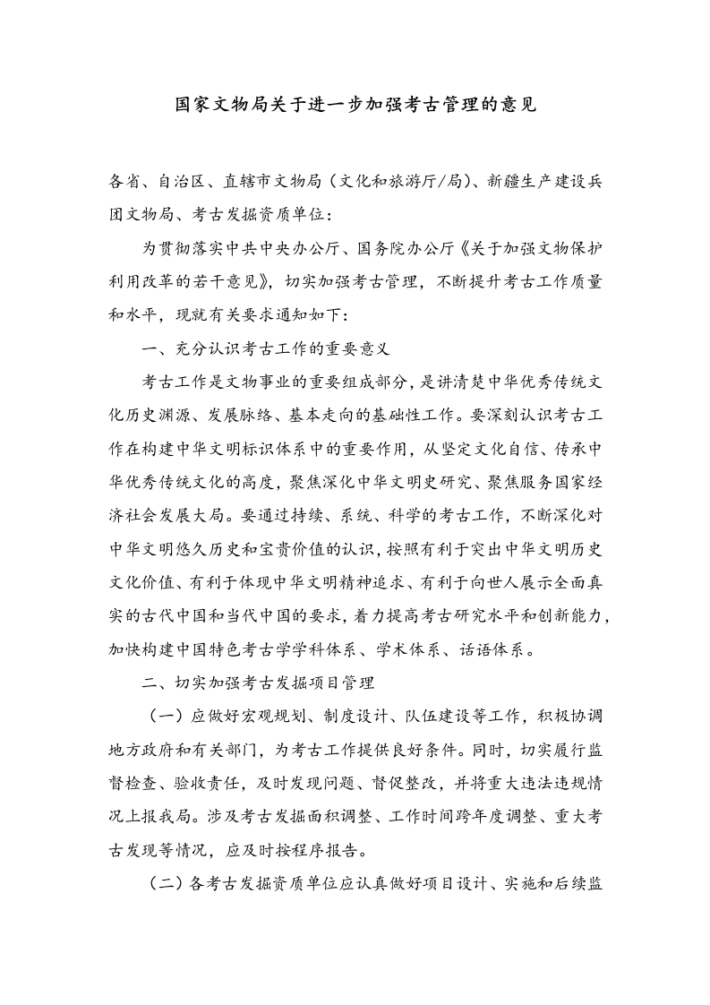 国家文物局关于进一步加强考古管理的意见各省、自治区、直辖市文物局(文化和旅游厅/局)、新疆生产建设兵团文物局、考古发掘资质单位:为贯彻落实中共中央办公厅、国务院办公厅《关于加强文物保护利用改革的若干意见》,切实加强考古管理,不断提升考古工作质量和水平,现就有关要求通知如下:一、充分认识考古工作的重要意义考古工作是文物事业的重要组成部分,是讲清楚中华优秀传统文化历史渊源、发展脉络、基本走向的基础性工作。要深刻认识考古工作在构建中华文明标识体系中的重要作用,从坚定文化自信、传承中华优秀传统文化的高度,聚焦深化中华文明史研究、聚焦服务国家经济社会发展大局。要通过持续、系统、科学的考古工作,不断深化对中华文明悠久历史和宝贵价值的认识,按照有利于突出中华文明历史文化价值、有利于体现中华文明精神追求、有利于向世人展示全面真实的古代中国和当代中国的要求,着力提高考古研究水平和创新能力,加快构建中国特色考古学学科体系、学术体系、话语体系。二、切实加强考古发掘项目管理(一)应做好宏观规划、制度设计、队伍建设等工作,积极协调地方政府和有关部门,为考古工作提供良好条件。同时,切实履行监督检查、验收责任,及时发现问题、督促整改,并将重大违法违规情况上报我局。涉及考古发掘面积调整、工作时间跨年度调整、重大考古发现等情况,应及时按程序报告。(二)各考古发掘资质单位应认真做好项目设计、实施和后续监管,建立健全考古工地管理、经费使用、出土文物和资料保管、检查验收、年度资料整理和报告编写、出土文物移交等各项规章制度,明确人员责任和工作要求。同时,应选派适宜的考古发掘项目负责人,严格落实工地现场管理责任,确保各项工作依法合规。三、牢固树立保护意识和课题意识(一)各考古发掘资质单位要坚持“保护为主、抢救第一、合理利用、加强管理”的文物工作方针,及时抢救保护重要文物,积极参与文物保护规划编制、大遗址保护展示、博物馆展陈、区域文物资源调查等工作,主动为文物保护利用工作提供专业意见和学术支撑。(二)各考古发掘资质单位应重视学术科研,制定本单位中长期学术发展规划,鼓励参与“考古中国”、“中华文明探源工程”、大遗址考古等重,点项目,开展多学科、跨学科联合攻关,不断提升考古发掘工作质量和科研水平。重要考古发掘项目应设置驻场专家组,配备文物保护人员,最大限度地获取各类信息。四、不断提升考古设施装备水平和工地安全水平(一)支持考古发掘资质单位加强自身建设,按照《考古装备及设施配备导则(试行)》要求,及时购置、更新考古设施和装备,切实加强文物库房、整理场地、资料室、移动实验室等设施建设。鼓励与地方政府、高校、其他科研机构合作共建科研基地和考古工作站,研发、配置考古专用设施装备。(二)切实加强考古发掘工地标准化和规范化建设,设置必要的围挡和标识,合理布设临时道路、堆土场、卫生间、临时库房等。重要考古发掘项目应配置现场保护移动平台,确保重要出土文物得到及时、妥善保护处理。