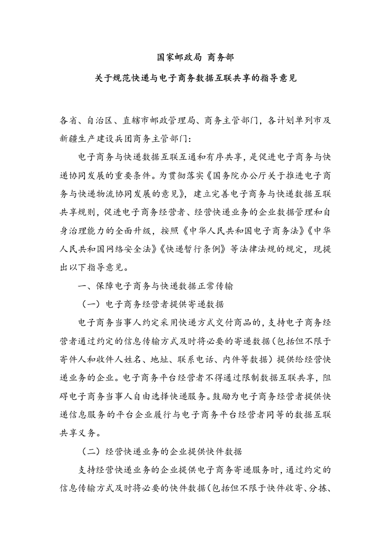 国家邮政局商务部关于规范快递与电子商务数据互联共享的指导意见各省、自治区、直辖市邮政管理局、商务主管部门,各计划单列市及新疆生产建设兵团商务主管部门:电子商务与快递数据互联互通和有序共享,是促进电子商务与快递协同发展的重要条件。为贯彻落实《国务院办公厅关于推进电子商务与快递物流协同发展的意见》,建立完善电子商务与快递数据互联共享规则,促进电子商务经营者、经营快递业务的企业数据管理和自身治理能力的全面升级,按照《中华人民共和国电子商务法》《中华人民共和国网络安全法》《快递暂行条例》等法律法规的规定,现提出以下指导意见。一、保障电子商务与快递数据正常传输(一)电子商务经营者提供寄递数据电子商务当事人约定采用快递方式交付商品的,支持电子商务经营者通过约定的信息传输方式及时将必要的寄递数据(包括但不限于寄件人和收件人姓名、地址、联系电话、内件等数据)提供给经营快递业务的企业。电子商务平台经营者不得通过限制数据互联共享,阻碍电子商务当事人自由选择快递服务。鼓励为电子商务经营者提供快递信息服务的平台企业履行与电子商务平台经营者同等的数据互联共享义务。(二)经营快递业务的企业提供快件数据支持经营快递业务的企业提供电子商务寄递服务时,通过约定的信息传输方式及时将必要的快件数据(包括但不限于快件收寄、分拣、运输、投递等节,点和轨迹数据)提供给电子商务经营者。经营快递业务的企业不得通过限制数据互联共享,阻碍电子商务经营者获取为消费者提供服务所必需的快件数据。二、加强电子商务与快递数据管控(三)依法采集共享用户数据通过电子商务平台使用快递服务的用户应当严格遵守邮件快件实名收寄相关规定,按照规范要求如实填写必要的用户信息。电子商务经营者和经营快递业务的企业采集、共享用户信息时,应当遵守法律、行政法规有关信息保护的规定,不得用于与其提供寄递服务无关的用途。(四)妥善存储使用用户数据电子商务经营者和经营快递业务的企业应当妥善存储用户数据。开展数据挖掘时,应当采用加密、脱敏等方式保护用户数据安全。利用用户大数据进行增值应用的,应当经过用户同意,并不得将具有个人隐私特征的数据提供给其他单位和个人。涉及数据跨境流动的,依照相关法律法规规定。三、加强电子商务与快递数据互联共享管理(五)建立完善的数据互联共享机制在确保用户信息安全的前提下,鼓励电子商务经营者与经营快递业务的企业之间依据相关标准开展数据互联共享,共同提升配送效率。支持电子商务经营者与经营快递业务的企业加强系统互联和业务联动,推动作业流程、数据交换有效衔接。四、建立电子商务与快递数据中断通知报告制度(六)建立数据中断风险评估制度