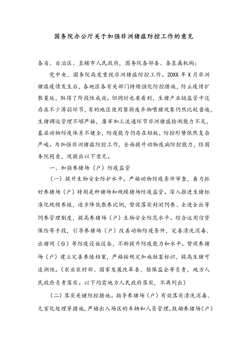 国务院办公厅关于加强非洲猪瘟防控工作的意见各省、自治区、直辖市人民政府,国务院各部委、各直属机构:党中央、国务院高度重视非洲猪瘟防控工作。20XX年X月非洲猪瘟疫情发生后,各地区各有关部门持续强化防控措施,防止疫情扩散蔓延,取得了阶段性成效。但同时也要看到,生猪产业链监管中还存在不少薄弱环节,有的地区使用餐厨废弃物喂猪现象仍然比较普遍,生猪调运管理不够严格,屠宰加工流通环节非洲猪瘟检测能力不足,基层动物防疫体系不健全,防疫能力仍存在短板,防控形势依然复杂严峻。为加强非洲猪瘟防控工作,全面提升动物疫病防控能力,经国务院同意,现提出以下意见。一、加强养猪场(户)防疫监管(一)提升生物安全防护水平。严格动物防疫条件审查,着力抓好养猪场(户)特别是种猪场和规模猪场防疫监管。深入推进生猪标准化规模养殖,逐步降低散养比例,督促落实封闭饲养、全进全出等饲养管理制度,提高养猪场(户)生物安全防范水平。综合运用信贷保险等手段,引导养猪场(户)改善动物防疫条件,完善清洗消毒、出猪间(台)等防疫设施设备,不断提升防疫能力和水平。督促养猪场(户)建立完善养殖档案,严格按规定加施牲畜标识,提高生猪可追溯性。(农业农村部、国家发展改革委、银保监会等负责,地方人民政府负责落实。以下均需地方人民政府落实,不再列出)(二)落实关键防控措施。指导养猪场(户)有效落实清洗消毒、无害化处理等措施,严格出入场区的车辆和人员管理。鼓励养猪场(户)自行开展非洲猪瘟检测,及早发现和处置隐患。督促养猪场(户)严格规范地报告疫情,做好疫情处置,严防疫情扩散。开展专项整治行动,严厉打击收购、贩运、销售、随意丢弃病死猪的违法违规行为,依法实行顶格处罚。加强病死猪无害化处理监管,指导自行处理病死猪的规模养猪场(户)配备处理设施,确保清洁安全、不污染环境。(农业农村部、公安部、生态环境部等负责)二、加强餐厨废弃物管理(三)严防餐厨废弃物直接流入养殖环节。推动尽快修订相关法律法规,进一步明确禁止直接使用餐厨废弃物喂猪,完善罚则。各地要对餐厨废弃物实行统一收集、密闭运输、集中处理、闭环监管,严防未经无害化处理的餐厨废弃物流入养殖环节。督促有关单位做好餐厨废弃物产生、收集、运输、存储、处理等全链条的工作记录,强化监督检查和溯源追踪。按照政府主导、企业参与、市场运作原则,推动建立产生者付费、处理者受益的餐厨废弃物无害化处理和资源化利用长效机制。(农业农村部、住房城乡建设部、市场监管总局、国家发展改革委、司法部、交通运输部、商务部等负责)(四)落实餐厨废弃物管理责任。各地要尽快逐级明确餐厨废弃物管理牵头部门,细化完善餐厨废弃物全链条管理责任,建立完善全链条监管机制。加大对禁止直接使用餐厨废弃物喂猪的宣传力度,对养猪场(户)因使用餐厨废弃物喂猪引发疫情或造成疫情扩散的,不给予强制扑杀补助,并追究各环节监管责任。(农业农村部、住房城乡建设部、市场监管总局、国家发展改革委、财政部等负责)