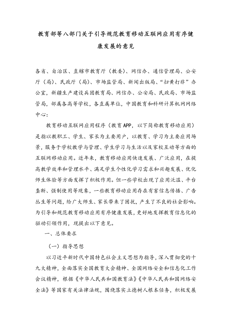 教育部等八部门关于引导规范教育移动互联网应用有序健康发展的意见各省、自治区、直辖市教育厅(教委)、网信办、通信管理局、公安厅(局)、民政厅(局)、市场监管局、新闻出版局、“扫黄打非”办公室,新疆生产建设兵团教育局、网信办、公安局、民政局、市场监管局,部属各高等学校,各直属单位,中国教育和科研计算机网网络中心:教育移动互联网应用程序(教育APP,以下简称教育移动应用)是指以教职工、学生、家长为主要用户,以教育、学习为主要应用场景,服务于学校教学与管理、学生学习与生活以及家校互动等方面的互联网移动应用。近年来,教育移动应用快速发展、广泛应用,在提高教学效率和管理水平、满足学生个性化学习需求和兴趣发展、优化师生体验等方面发挥了积极作用。但一些学校出现了应用泛滥、平台垄断、强制使用等现象,一些教育移动应用存在有害信息传播、广告丛生等问题,给广大师生、家长带来了困扰,产生了不良的社会影响。为引导和规范教育移动应用有序健康发展,更好地发挥教育信息化的驱动引领作用,现提出以下意见。一、总体要求(一)指导思想以习近平新时代中国特色社会主义思想为指导,深入贯彻党的十九大精神,全面落实全国教育大会精神、全国网络安全和信息化工作会议精神,根据《中华人民共和国教育法》《中华人民共和国网络安全法》等国家有关法律法规,围绕落实立德树人根本任务,积极发展“互联网+教育”、办好网络教育,全面深化“放管服”改革,实施包容审慎监管,引导教育移动应用健康有序发展,为广大师生营造健康、有序、安全的网络空间和学习环境。(二)基本原则科学施策、分类引导。正确处理政府与市场、管理与服务、安全与发展的关系。分类引导不同教育阶段和类型、不同用户群体、不同功能用途的教育移动应用,构建良好教育生态。问题导向、标本兼治。围绕群众反映强烈的问题,从供给侧和需求侧两端进行规范。开展专项行动治理乱象,建章立制规范管理,提质增效支撑发展,综合施策打好组合拳。多方参与、协同联动。以构建常态化的治理体系为关键,建立政府管理、企业履责、专家献策、学校把关、家长监护、社会监督、行业自律等多主体参与、职责明晰的综合协同治理体系。(三)工作目标全面治理教育移动应用乱象,补齐监督短板,规范全生命周期管理,提高开发供给质量,营造优良发展生态,促进教育移动应用有序健康发展。20XX年底,完成教育移动应用备案工作。开展教育移动应用专项治理行动,群众反映强烈的问题得到有效缓解。2020年底,建立健全教育移动应用管理制度、规范和标准,形成常态化的监管机制,初步建成科学高效的治理体系。二、提高供给质量(四)建立备案制度。教育移动应用提供者应当在取得ICP备案(涉及经营电信业务的,还应当申请电信业务经营许可)、网络安全等级保护定级备案的证明、等级测评报告后,向机构住所地的省级教