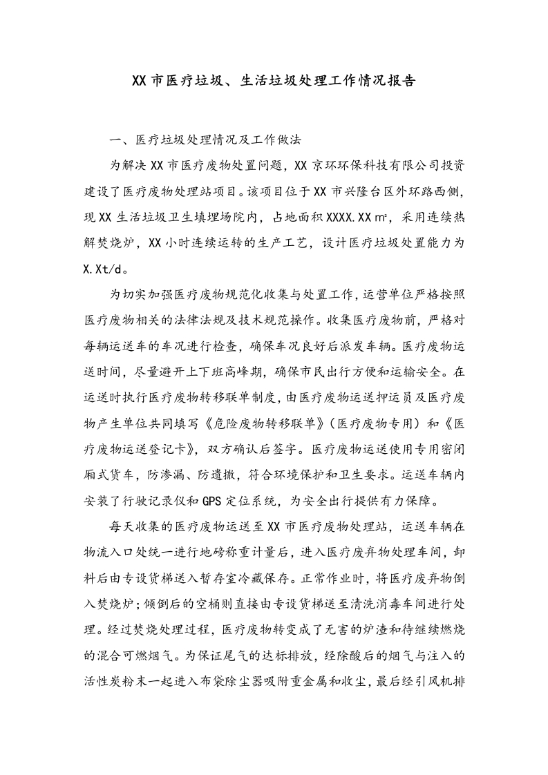 X市医疗垃圾、生活垃圾处理工作情况报告一、医疗垃圾处理情况及工作做法为解决X市医疗废物处置问题,X京环环保科技有限公司投资建设了医疗废物处理站项目。该项目位于X市兴隆台区外环路西侧,现X生活垃圾卫生填埋场院内,占地面积XXX.XX,采用连续热解焚烧炉,X小时连续运转的生产工艺,设计医疗垃圾处置能力为X.Xt/d。为切实加强医疗废物规范化收集与处置工作,运营单位严格按照医疗废物相关的法律法规及技术规范操作。收集医疗废物前,严格对每辆运送车的车况进行检查,确保车况良好后派发车辆。医疗废物运送时间,尽量避开上下班高峰期,确保市民出行方便和运输安全。在运送时执行医疗废物转移联单制度,由医疗废物运送押运员及医疗废物产生单位共同填写《危险废物转移联单》(医疗废物专用)和《医疗废物运送登记卡》,双方确认后签字。医疗废物运送使用专用密闭厢式货车,防渗漏、防遗撒,符合环境保护和卫生要求。运送车辆内安装了行驶记录仪和GS定位系统,为安全出行提供有力保障。每天收集的医疗废物运送至X市医疗废物处理站,运送车辆在物流入口处统一进行地磅称重计量后,进入医疗废弃物处理车间,卸料后由专设货梯送入暂存室冷藏保存。正常作业时,将医疗废弃物倒入焚烧炉:倾倒后的空桶则直接由专设货梯送至清洗消毒车间进行处理。经过焚烧处理过程,医疗废物转变成了无害的炉渣和待继续燃烧的混合可燃烟气。为保证尾气的达标排放,经除酸后的烟气与注入的活性炭粉末一起进入布袋除尘器吸附重金属和收尘,最后经引风机排入烟囱扩散到大气中。经过本烟气净化系统的烟气,符合GBXXXXX-XXXX《危险废物焚烧污染控制标准》排放限值。二、生活垃圾处理情况及工作做法(一)推进生活垃圾处理体系建设为推进X市环卫事业不断向专业化、社会化、市场化、城乡一体化协调均衡发展,全面提升X市环卫行业管理、技术装备水平和应急保障能力,X市政府同北京环卫集团合作,共同打造X市城乡一体化大环卫体系。X市城乡一体化大环卫体系建设自XXX年X月开始启动,市政府出台了《XX市构建一体化大环卫体系工作实施方案》,同北京环卫集团签订了《XX市一体化大环卫合作框架协议》。XXX年X月X日开始,北京环卫集团按照每个镇((街道)至少配置一台垃圾车的标准,利用各个村的垃圾暂存点及各个村屯的桶群,点做为垃圾转运对接站点,采用公交车的运行模式,启动了“户集、村收、环卫服务公司统一转运处理”的农村垃圾收运工作,全市农村生活垃圾统一运送到XX市生活垃圾卫生填埋场进行无害化处理。农村垃圾一体化转运处理覆盖全市农村X个镇(街道)XX个行政村(社区),日平均垃圾转运处理量为XXX吨左右。通过城乡一体化大环卫体系建设,我市已基本建立起职责明确、监管有力、运行高效的环卫管理体制和运行机制,形成了以政府为主导、社会力量参与的环卫管理新格局。环卫作业质量明显改善,城市品位进一步提升。(二)加强垃圾处理设施运行管理X市生活垃圾卫生填埋场是我市唯一的生活垃圾处理场,由X