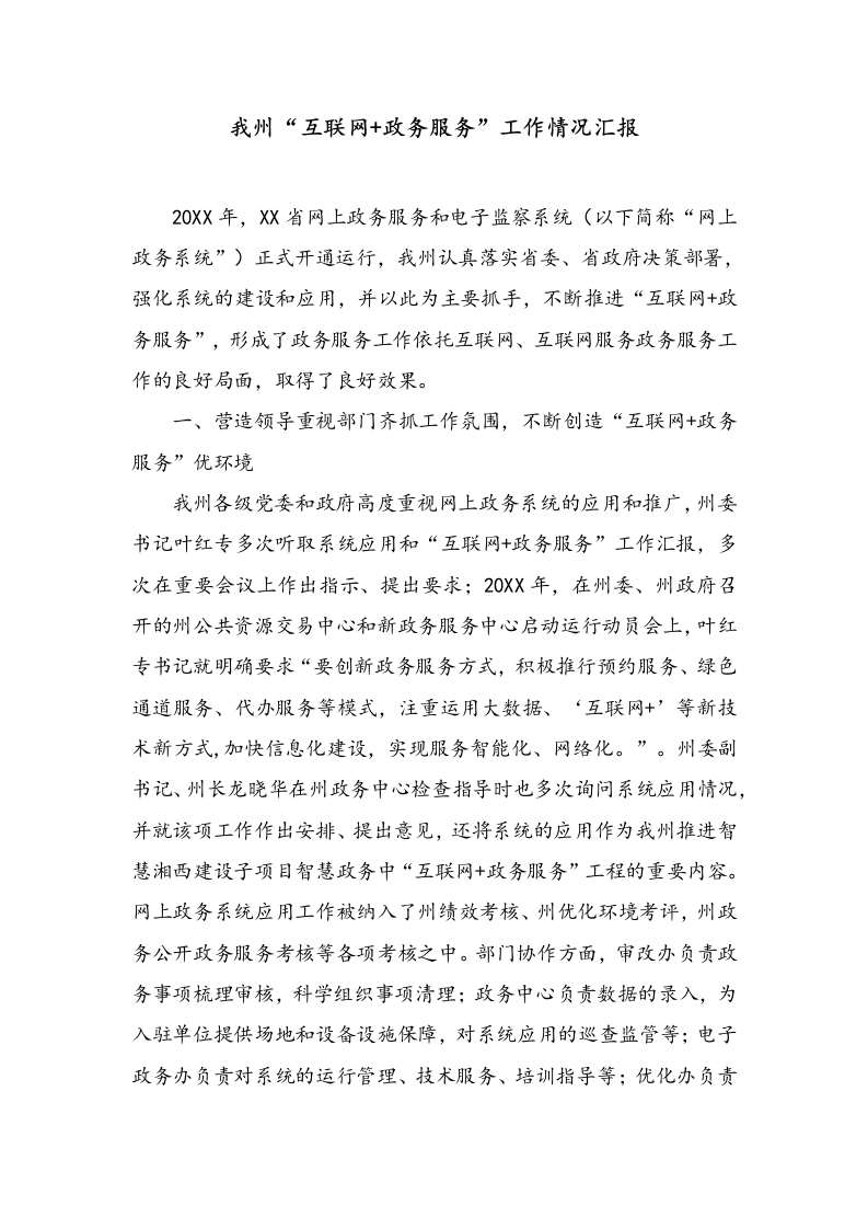 我州“互联网+政务服务”工作情况汇报20XX年,X省网上政务服务和电子监察系统(以下简称“网上政务系统”)正式开通运行,我州认真落实省委、省政府决策部署,强化系统的建设和应用,并以此为主要抓手,不断推进“互联网+政务服务”,形成了政务服务工作依托互联网、互联网服务政务服务工作的良好局面,取得了良好效果。一、营造领导重视部门齐抓工作氛围,不断创造“互联网+政务服务”优环境我州各级党委和政府高度重视网上政务系统的应用和推广,州委书记叶红专多次听取系统应用和“互联网+政务服务”工作汇报,多次在重要会议上作出指示、提出要求;20XX年,在州委、州政府召开的州公共资源交易中心和新政务服务中心启动运行动员会上,叶红专书记就明确要求“要创新政务服务方式,积极推行预约服务、绿色通道服务、代办服务等模式,注重运用大数据、‘互联网+’等新技术新方式,加快信息化建设,实现服务智能化、网络化。”。州委副书记、州长龙晓华在州政务中心检查指导时也多次询问系统应用情况,并就该项工作作出安排、提出意见,还将系统的应用作为我州推进智慧湘西建设子项目智慧政务中“互联网+政务服务”工程的重要内容。网上政务系统应用工作被纳入了州绩效考核、州优化环境考评,州政务公开政务服务考核等各项考核之中。部门协作方面,审改办负责政务事项梳理审核,科学组织事项清理;政务中心负责数据的录入,为入驻单位提供场地和设备设施保障,对系统应用的巡查监管等;电子政务办负责对系统的运行管理、技术服务、培训指导等:优化办负责系统的应用监督;各具有行政审批职能的单位负责使用系统。我州通过构建责任、培训、监督、保障“四大体系”,夯实组织、服务、管理、发展“四大基础”,实行季度通报制度、零办件说明制度、监察约谈机制等,对网上审批不到位、二次录入、体外循环等现象启动问责,形成了全员重视的大气候、营造了追责问效的浓氛围、取得了令人可喜的好成绩。截止到20XX年X月X日,全州累计应用系统收件XXXXX件、办结XXXXXX件、办结率XX.XX%,州本级收件XXXXX件、办结XXXXX件、办结率X.XX%,自启用系统以来州本级未产生罚牌,在全省XX个市州中绝无仅有。20XX年X月,在全省推进行政审批规范化电子化建设电视电话会议上我州的系统应用工作受到通报表扬;20XX年X月,全省网上政务服务和电子监察系统现场推进会在我州凤凰县召开,我州作为唯一代表在大会作交流发言;20XX年X月,在常德市召开的全省网上政务服务和电子监察系统应用现场交流会上,我州再次作了典型交流发言。20XX年X月,由州政务中心撰写的《湘西州深化网上政务服务和电子监察系统应用不断推进“互联网+政务服务”》材料被省政府发展研究中心(省电子政务办)主办的“X电子政务”采用,作为经验交流在全省推介。二、大力发展各级政务服务中心建设,不断搭建“互联网+政务服务”大平台一直以来,我州都把发展政务服务中心建设作为转变政府职能、提高服务效率、方便群众办事、优化经济发展环境,落实简政放权、放管结合、优化服务的重要推手。20XX年初,州委、州政府采纳了由州政务中心在进行调查研究基础上,根据中央、省有关精神和要求,结合州情,在认真总结我州政务中心自组建运行近十年来经验和存在