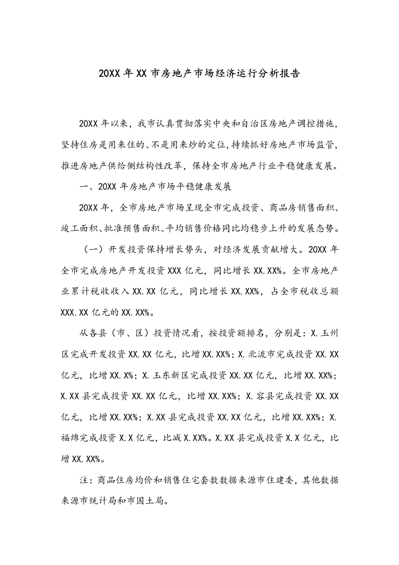 20XX年X市房地产市场经济运行分析报告20XX年以来,我市认真贯彻落实中央和自治区房地产调控措施,坚持住房是用来住的、不是用来炒的定位,持续抓好房地产市场监管,推进房地产供给侧结构性改革,保持全市房地产行业平稳健康发展。一、20XX年房地产市场平稳健康发展20XX年,全市房地产市场呈现全市完成投资、商品房销售面积、竣工面积、批准预售面积、平均销售价格同比均稳步上升的发展态势。(一)开发投资保持增长势头,对经济发展贡献增大。20XX年全市完成房地产开发投资XX亿元,同比增长X.XX%。全市房地产业累计税收收入XX亿元,同比增长X.X%,占全市税收总额XXX.XX亿元的XX.XX%。从各县(市、区)投资情况看,按投资额排名,分别是:X.玉州区完成开发投资X.X亿元,比增X.X%;X.北流市完成投资X.X亿元,比增X.%;X.玉东新区完成投资X.X亿元,比增X.X%;X.XX县完成投资X.X亿元,比增X.XX%;X.容县完成投资X.X亿元,比增X.X%;X.X县完成投资X.XX亿元,比增X.XX%;X.福绵完成投资X.X亿元,比减X.XX%。X.XX县完成投资XX亿元,比增XX.XX%。注:商品住房均价和销售住宅套数数据来源市住建委,其他数据来源市统计局和市国土局。(二)开发建设态势良好,商品房供销两旺。20XX年全市新建商品房批准预售面积XXX.X万平方米,同比增长XX.X%(其中新建商品住房批准预售面积XX.XX万平方米,同比增长X.X%)。销售面积XXX万平方米,同比增长X%。新建商品房成交XXX万套。其中,X城区(包括玉州、福绵、玉东)XXX万套,XX万平方米;北流XX万平方米:XX县XXXX套,XX万平方米:XX县XXXX套,XX万平方米。(三)商品房销售价格稳上涨明显。受土地拍卖价格大幅升高及一批精装楼盘高价入市影响,全市商品房销售价位稳中有升。全市商品房平均销售价格XXX元/平方米,同比增长X.XX%(其中商品住房XXXX元/平方米,同比增长XX.XX%)。销售均价最高是XX城区XXXX元/平方米(其中玉东XXXX元/平方米),最低是X县XXX元/平方米。容县XXXX元/平方米,北流XXXX元/平方米,XXXXXX元/平方米,XXXXXX元/平方米。(四)去库存成效明显。随着房地产市场行情向好,房地产的库存规模逐步降到合理水平。至X月底,商品房存量面积XX.X万平方米,消化周期为XX.XX个月(其中,商品住房存量面积XX.XX万平方米,消化周期为X.X个月:非住宅商品房存量面积X.XX万平方米,消化周期为X.X个月)。(五)房地产金融支持力度加大。在当前经济环境下,房贷依然是银行相对优质的贷款对象,尽管受到管控,增长趋势并未发生改变。