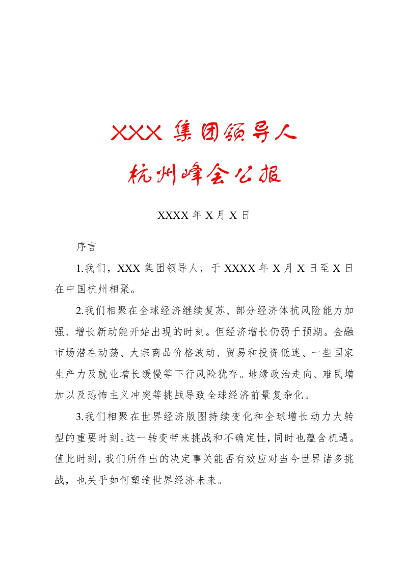 XXXX年X月X日序言1.我们,XXX集团领导人,于XXXX年X月X日至X日在中国杭州相聚。2.我们相聚在全球经济继续复苏、部分经济体抗风险能力加强、增长新动能开始出现的时刻。但经济增长仍弱于预期。金融市场潜在动荡、大宗商品价格波动、贸易和投资低迷、一些国家生产力及就业增长缓慢等下行风险犹存。地缘政治走向、难民增加以及恐怖主义冲突等挑战导致全球经济前景复杂化。3.我们相聚在世界经济版图持续变化和全球增长动力大转型的重要时刻。这一转变带来挑战和不确定性,同时也蕴含机遇。值此时刻,我们所作出的决定事关能否有效应对当今世界诸多挑战,也关乎如何塑造世界经济未来。4.我们坚信,XXX集团建立更紧密伙伴关系,携手行动,将为世界经济增长传递信心,提供动力,增进合作,促进普遍繁荣,造福各国人民。5.我们决心构建创新、活力、联动、包容的世界经济,并结合2030年可持续发展议程、亚的斯亚贝巴行动议程和《巴黎协定》,开创全球经济增长和可持续发展的新时代。6.为此,XXX集团作为国际经济合作主要论坛,同意根据以下原则,就推动世界经济强劲、可持续、平衡和包容增长的一揽子政策和措施形成“杭州共识”:一一放眼长远。我们将完善XXX集团增长议程,发掘增长新动力,开辟新增长点,以创新和可持续的方式推动经济转型,更好地维护当代和子孙后代共同利益。一一综合施策。我们将创新经济增长理念和政策,财政、货币和结构性改革政策相互配合,经济、劳动、就业和社会政策保持一致,需求管理和供给侧改革并重,短期政策与中长期政策结合,经济社会发展与环境保护共进。一一扩大开放。我们将继续努力建设开放型世界经济,反对保护主义,促进全球贸易和投资,加强多边贸易体制,确保全球化背景下的经济增长提供惠及更多人的机遇、得到公众普遍支持。一一包容发展。我们将确保经济增长的成果普惠共享,满足