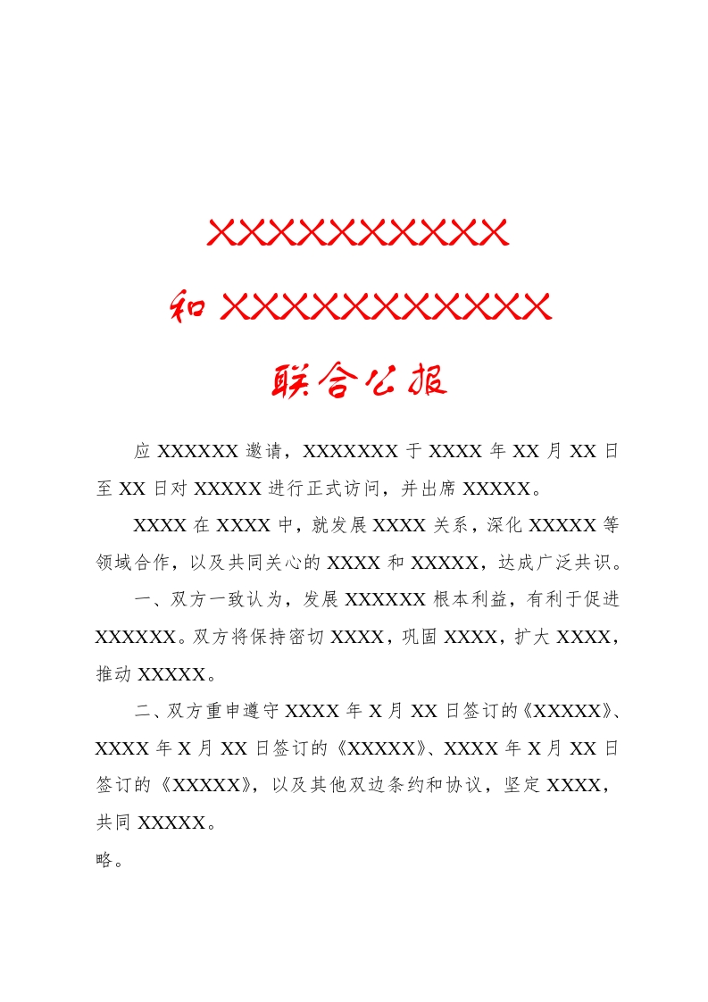 XXXXXXXXXX阳XXXXXXXXXX至XX日对XXXXX进行正式访问,并出席XXXXX。XXXX在XXXX中,就发展XXXX关系,深化XXXXX等领域合作,以及共同关心的XXXX和XXXXX,达成广泛共识。一、双方一致认为,发展XXXXXX根本利益,有利于促进XXXXXX。双方将保持密切XXXX,巩固XXXX,扩大XXXX,二、双方重申遵守XXXX年X月XX日签订的《XXXXX》、XXXX年X月XX日签订的《XXXXX》、XXXX年X月XX日签订的《XXXXX》,以及其他双边条约和协议,坚定XXXX,共同XXXXX。略。XXXXXXXXXXXXXX(签字)XXXXXX(签字)XXXX年XX月XX日于北京