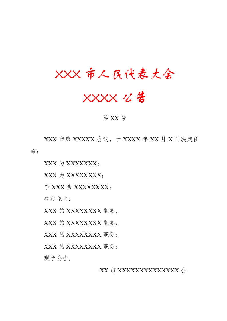 XXXX告第XX号XXX市第XXXXX会议,于XXXX年XX月X日决定任命:李XXX为XXXXXXXX:决定免去:XXX的XXXXXXXX职务;XXX的XXXXXXXX职务;XXX的XXXXXXXX职务;XXX的XXXXXXXX职务;现予公告。XX市XXXXXXXXXXXXXX会XXXX年XX月X日