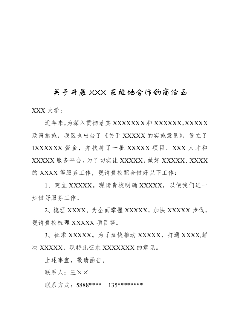 XXX大学:近年来,为深入贯彻落实XXXXXXX和XXXXXX,XXXXX政策措施,我区也出台了《关于XXXXX的实施意见》,设立了XXXXX服务平台。为了切实让XXXXX,做好XXXXX、XXXX的XXXX等服务工作,现请贵校配合做好以下工作:1、建立XXXXX。现请贵校明确XXXXX,以便我们进一步做好服务工作。2、梳理XXXX。为全面掌握XXXXX,加快XXXXX步伐,现请贵校梳理XXXXX项目等。3、征求XXXXX。为了加快推动XXXXX,打通XXXX,解决XXXXX,现特此征求XXXXXXX的意见。上述事宜,敬请函告。联系方式:5888****135********传真:5888***邮箱:****@126.C0MXX区委XXXXXXXX年X5月X日XX区委XX部XXXX年X月X日印发