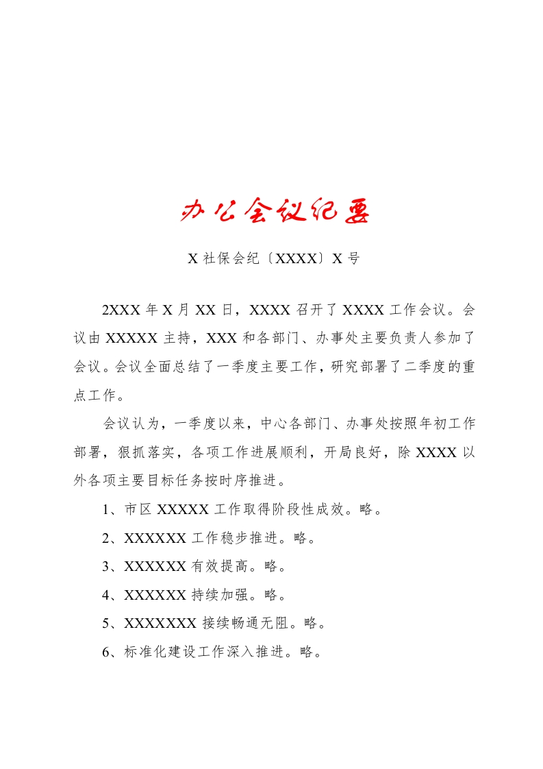 X社保会纪〔XXXX)X号2XXX年X月XX日,XXXX召开了XXXX工作会议。会议由XXXXX主持,XXX和各部门、办事处主要负责人参加了会议。会议全面总结了一季度主要工作,研究部署了二季度的重点工作。会议认为,一季度以来,中心各部门、办事处按照年初工作部署,狠抓落实,各项工作进展顺利,开局良好,除XXXX以外各项主要目标任务按时序推进。1、市区XXXXX工作取得阶段性成效。略。2、XXXXXX工作稳步推进。略。3、XXXXXX有效提高。略。4、XXXXXX持续加强。略。6、标准化建设工作深入推进。略。7、XXXXX成效明显。略。8、XXXXXXX保障有力。略。9、XXXX增添XXXXX。略。10、内部管理工作有序开展。略。XXXX年X月XX日XXXX年X月XX日印发