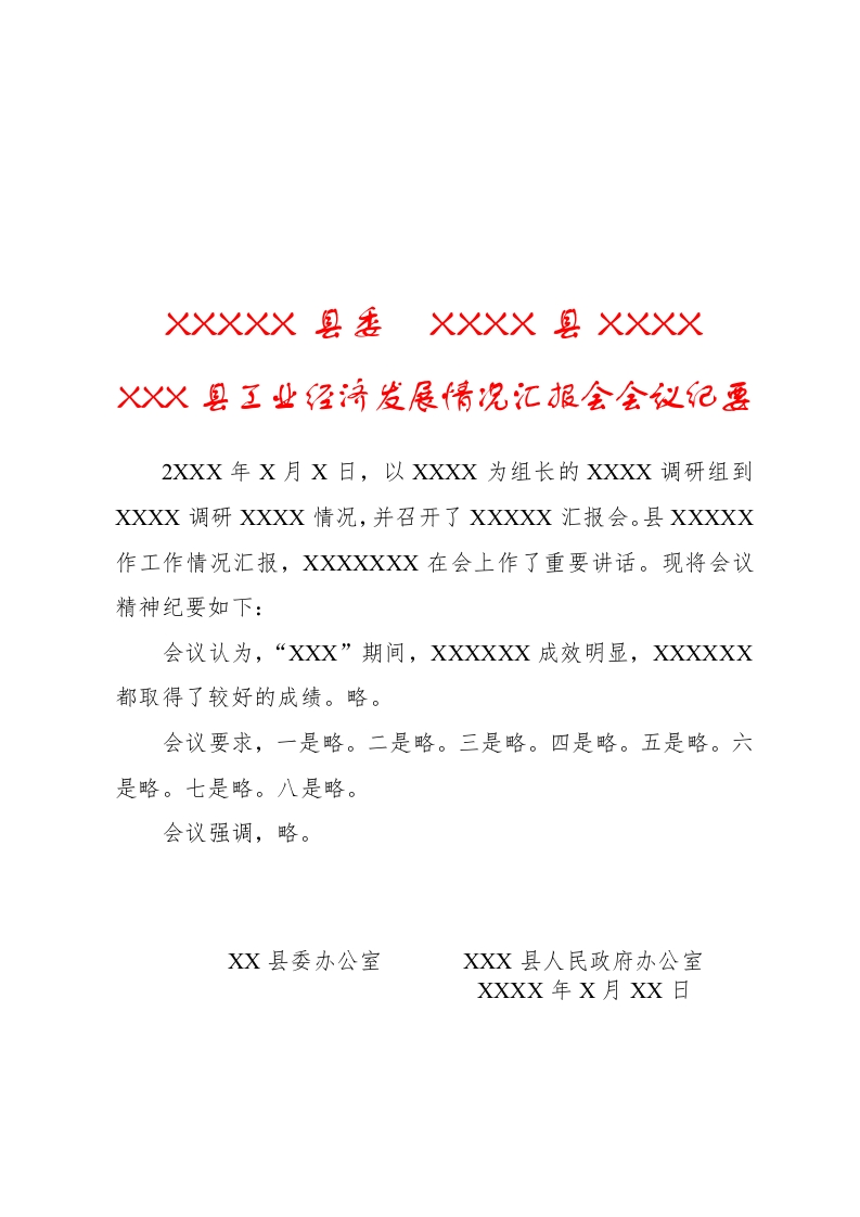 XXXXX县委2XXX年X月X日,以XXXX为组长的XXXX调研组到作工作情况汇报,XXXXXXX在会上作了重要讲话。现将会议精神纪要如下:会议认为,“XXX”期间,XXXXXX成效明显,XXXXXX都取得了较好的成绩。略。会议要求,一是略。二是略。三是略。四是略。五是略。六是略。七是略。八是略。会议强调,略。XX县委办公室XXX县人民政府办公室XXXX年X月XX日XX县委办公室XXXX年X月XX日印发