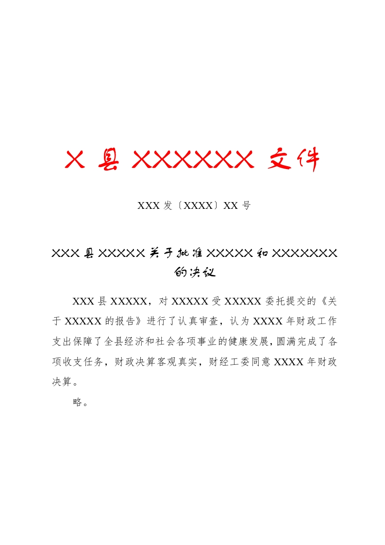 XXX发(XXXX)XX号XXX县XXXXX关于批准XXXXX和XXXXXXXXXX县XXXXX,对XXXXX受XXXXX委托提交的《关于XXXXX的报告》进行了认真审查,认为XXXX年财政工作支出保障了全县经济和社会各项事业的健康发展,圆满完成了各项收支任务,财政决算客观真实,财经工委同意XXXX年财政决算。略。XX县XXXXXX办公室XXXX年XX月XX日主题词:主要指标调整决定抄送:县委,市人大常委会办公室,县人大常委会组成人员,县人民法院,县人民检察院,县政府办,财政局,各镇人大。XX县人大常委会办公室XXXX年XX月XX日印发