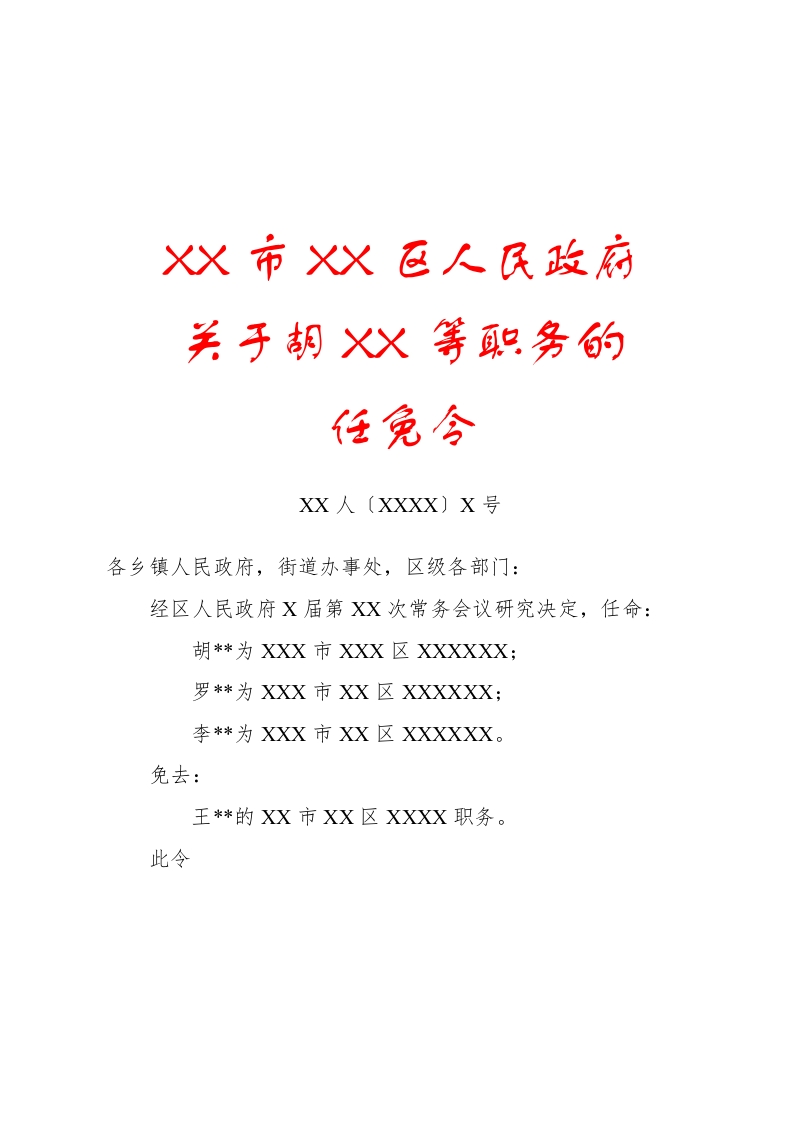 各乡镇人民政府,街道办事处,区级各部门:经区人民政府X届第XX次常务会议研究决定,任命:胡*为XXX市XXX区XXXXXX;罗**为XXX市XX区XXXXXX;李*为XXX市XX区XXXXXX。免去:王*的XX市XX区XXXX职务。此令XX市XX区人民政府XXXX年X月XX日