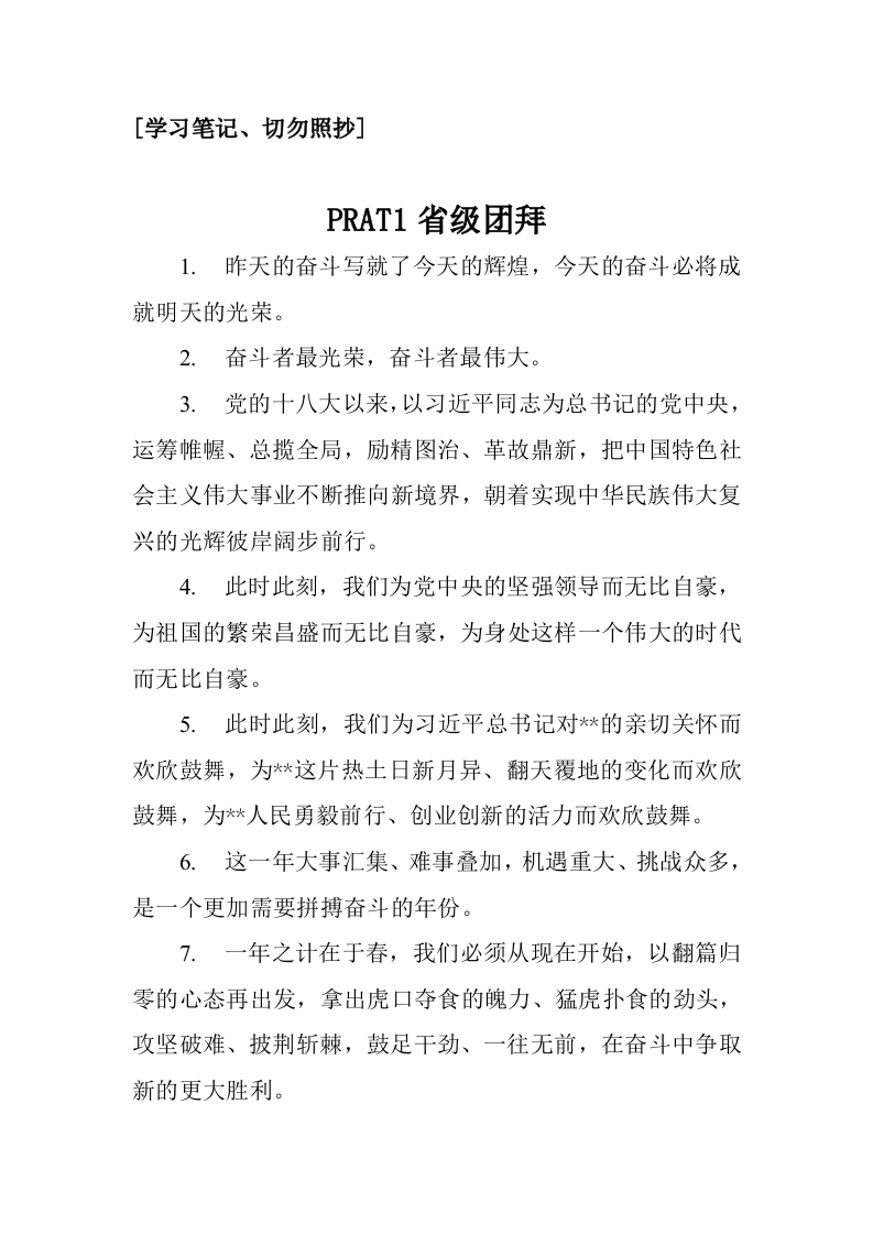 [学习笔记、切勿照抄]PRAT1省级团拜1.昨天的奋斗写就了今天的辉煌,今天的奋斗必将成就明天的光荣。2.奋斗者最光荣,奋斗者最伟大。3.党的十八大以来,以习近平同志为总书记的党中央,运筹帷幄、总揽全局,励精图治、革故鼎新,把中国特色社会主义伟大事业不断推向新境界,朝着实现中华民族伟大复兴的光辉彼岸阔步前行。4.此时此刻,我们为党中央的坚强领导而无比自豪,为祖国的繁荣昌盛而无比自豪,为身处这样一个伟大的时代而无比自豪。5.此时此刻,我们为习近平总书记对*的亲切关怀而欢欣鼓舞,为*这片热土日新月异、翻天覆地的变化而欢欣鼓舞,为*人民勇毅前行、创业创新的活力而欢欣鼓舞。6.这一年大事汇集、难事叠加,机遇重大、挑战众多,是一个更加需要拼搏奋斗的年份。7.一年之计在于春,我们必须从现在开始,以翻篇归零的心态再出发,拿出虎口夺食的魄力、猛虎扑食的劲头,攻坚破难、披荆斩棘,鼓足干劲、一往无前,在奋斗中争取新的更大胜利。8.过去的一年,是我们砥砺奋进、岁物丰成的一年。9.让我们更加紧密地团结在以习近平同志为核心的党中央周围,不忘初心、继续前进,撸起袖子加油干,奋力谱写决胜全面小康、让中原更加出彩的美好篇章。10.过去的一年,全省广大干部群众共克时艰、奋发进取。11.面对错综复杂的内外环境和经济下行压力,我们打了一场供给侧结构性改革的硬仗;我们打了一场全面深化改革的硬仗;我们打了一场脱贫攻坚战的硬仗;我们打了一场抗洪抢险救灾的硬仗。12.人们就业的渠道更宽了,工人、农民、机关事业单位人员的收入越来越高了;城乡居民最低生活保障标准提升了,贫困群众就医看病负担越来越轻了;一部分农村成为美丽乡村,农民生活越来越好了;乡村旅游火起来了,城市居民休闲度假的好去处越来越多了;党风政风社会风气出现新的变化,人民群众干事创业的劲头越来越足了。13.自觉走加快转型、绿色发展、跨越提升新路。14.要坚定不移推进供给侧结构性改革,给人们提供更多就业机会和发展平台。15.要坚定不移治理环境污染,打一场科学治霾、协同治霾、铁腕治霾的人民战争。16.要坚定不移抓好脱贫攻坚,确保小康路上一个都不