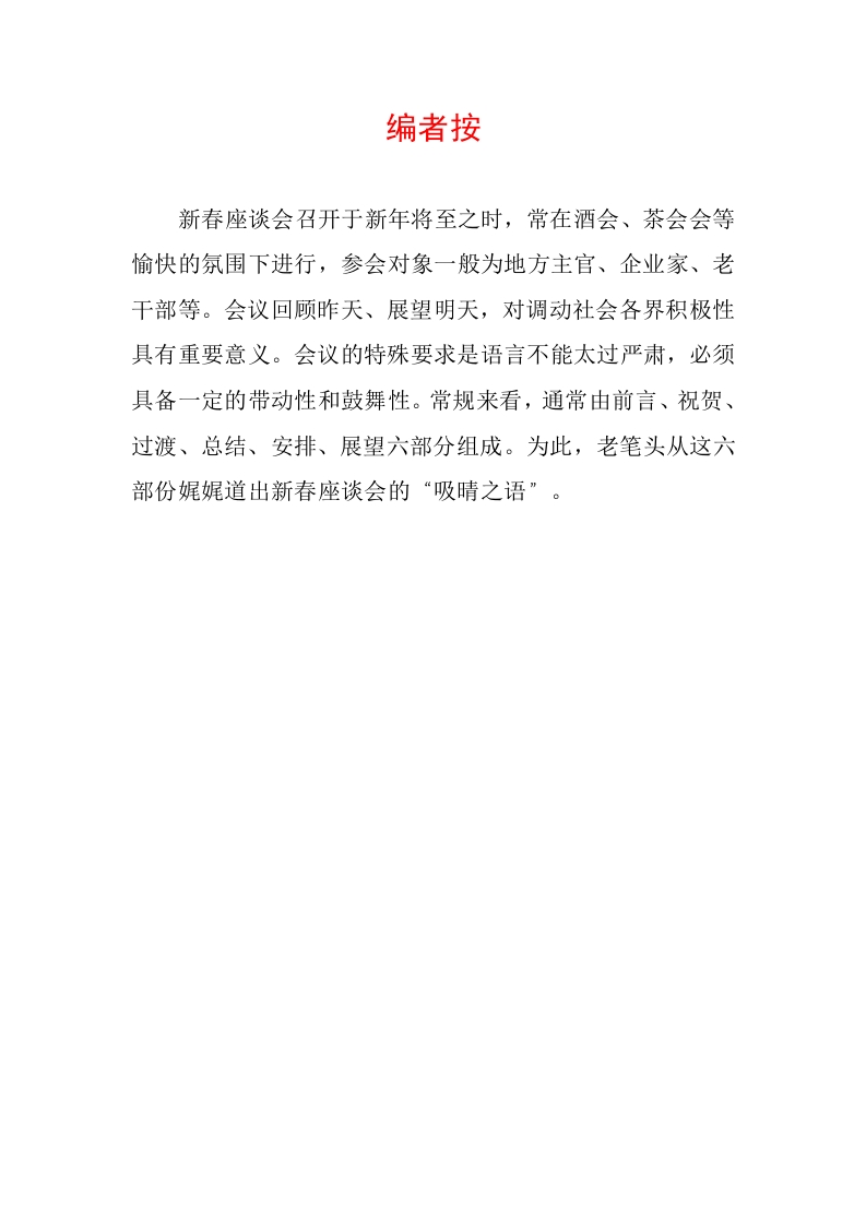 编者按新春座谈会召开于新年将至之时,常在酒会、茶会会等愉快的氛围下进行,参会对象一般为地方主官、企业家、老干部等。会议回顾昨天、展望明天,对调动社会各界积极性具有重要意义。会议的特殊要求是语言不能太过严肃,必须具备一定的带动性和鼓舞性。常规来看,通常由前言、祝贺、过渡、总结、安排、展望六部分组成。为此,老笔头从这六部份娓娓道出新春座谈会的“吸晴之语”。目录吸晴1前言要引人入胜吸晴2祝贺要恰如其分吸晴3过渡要自然而然吸晴4总结要身临其境吸晴5部署要系统周密吸晴6展望要慷锵有力