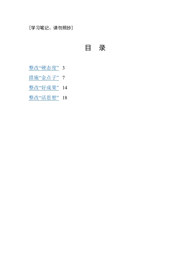 [学习笔记、请勿照抄]目录整改“硬态度”3措施“金点子”7整改“好成果”14整改“活思想”18整改“硬态度”01-坚决照单全收,坚持立行立改,真认账、不推诿,真整改、不敷衍,坚决把讲政治贯穿整改全过程,坚决做到整改责任全承担,坚决实现所有问题全整改,坚决推进整改要求全落实。02-所谓“回头看”,就是对己巡视过的单位,事先不确定,杀个“回马枪”,检查整改成效,发现新的问题。03-随着“普遍开展专项巡视成为巡视工作的新常态”,“回头看”的意涵也变得愈发具体明确一一它其实是专项巡视的一种形式,是这一“新型有力武器”的“必杀技”之一。04-“回头看”一一剑指吏治腐败官员特权,再次给持观望态度的人们注入了一针“强心剂”。05-巡视工作不是走过场,更不是为“评功摆好”、“唱赞歌”收集资料,而是利用查找问题的“火眼金睛”,实打实、真对真地揪出“老虎”尾巴,痛击恼人“苍蝇”,为营造“风清气正”的社会环境出实招、谋实效。