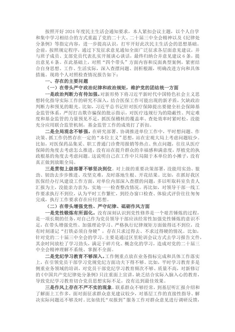按照开好2024年度民主生活会通知要求,本人紧扣会议主题,以个人自学和集中学习相结合的方式重温了党的二十大、二十届三中全会精神以及《纪律处分条例》等指定内容,进一步提高认识,打牢开好此次民主生活会的思想基础。会前,按照规定程序,通过下发征求意见通知全面广泛征求各层面意见建议,并与班子成员、支部党员代表扎实开展谈心谈话,最终归纳合并意见建议6条,提出意见6条。在此基础上,对照“四个带头”方面内容和反面典型案例,紧密结合自身思想、工作、生活实际,深入查摆问题、剖析根源,明确改进方向和具体措施。现将个人对照检查情况报告如下:一、存在的主要问题(一)在带头严守政治纪律和政治规矩,维护党的团结统一方面一是政治判断力有待加强。对新形势下将习近平新时代中国特色社会主义思想转化指导实际工作的研究不深入,结合医保工作可能出现的新矛盾,欠缺政治判断力和预见的眼光。比如,习近平总书记针对医疗保障提出要健全社会保障基金监管体系,严厉打击欺诈骗保的批示指示,对医疗违规行为的隐蔽性、判定难度和基金监管的力量预见不足,抓医保稽核的覆盖率、查处效率时紧时松,没能充分应用联合监管机制,基金监管工作的成效打了折扣。二是全局观念不够强。在研究部署、协调推进单位工作中,平时想问题、作决策、抓工作仍然存在一定的“本位主义”思想,站在宏观大局上考虑问题较少。比如,对医保药品集采、职工普通门诊费用报销等热点、焦点问题,往往从医疗保障的角度去考虑怎么推进,没有站在提升群众的幸福感和满意度,厚植党的执政根基的角度去考虑问题。这说明自己在工作中只局限于本单位的小摊子,没有真正做到放眼全局。三是贯彻上级部署不够坚决到位。对上级的重要决策部署,没能用实劲、狠劲、韧劲去步步推进、攻坚克难,及时落地生根、开花结果。比如,在抓好我区医保经办行风建设工作方面,对单位内部深入查摆的问题,多以听取科室负责人汇报为主,没能亲力亲为,实地一一检查整改情况。再比如,对领导干部一线工作要求执行不到位,认为平时工作繁忙,到经办窗口检查、体验式评价往往匆匆完成,执行工作要求存在应付思想。(二)在带头增强党性、严守纪律、砥砺作风方面一是党性锻炼有所弱化。没有深刻认识到党性修养是一个艰苦锤炼的过程,是一项长期的任务,对自己作为党员领导干部应该经常性加强党性锤炼的意识不足,在带头增强党性、加强理论学习、严格执行纪律规矩方面做得还不到位,没有时刻谨记“打铁必须自身硬”,存在只求过得去、不求过得硬的情况。比如,针对党的二十届三中全会的学习,主要是通过区里轮训会议方式去学习报告文件,其余时间放松了学习劲头,满足于碎片化、概念化的学习,造成对党的二十届三中全会精神理解不系统、掌握不全面。二是党纪学习教育不够深入。工作侧重点放在业务指标完成和具体工作落实上,在引领党员干部学习党规党纪方面功夫下得不够。比如,平时学习教育多是侧重业务领域的培训,对党员干部党纪学习教育频次不够、质量不高,对新修订的《中国共产党纪律处分条例》只注重面上宣讲,缺乏结合实际入脑入心的教育,导致党纪学习教育切合党员思想实际不足,没有达到最佳效果。三是作风上存在不严不实的现象。联系群众不够经常,到基层听汇报介绍和了解面上工作多,面对面征求群众意见建议较少,对基层工作的直接性指导、解决实际问题还不够及时。比如依托“双报到”服务工作对群众意见进行调研反馈,多是听汇总后的情况报告,没有面对面直接了解群众的想法。即使去了基层一线调研,也只注重自己想要了解的问题,调研基层反映的问题不全面,为基层群众排忧解难的力度不够大。(三)带头在遵规守纪、清正廉洁前提下勇于担当、敢于创新方面一是攻坚克难锐气不足。当前,医疗保障工作改革进入深水区,政策变化快,改革的难度大。对医保工作的民生保障战略意义认识不到位,没有对标先进,主动破解工作中深层次的问题。比如,新形势下医保基金链条长,欺诈骗保隐蔽度高,监管难度很大,对医保基金监管工作只是强调要按照时限完成规定任务,但开展稽核的覆盖进度、检查效果、整改情况没有持续跟进、一抓到底。这反映出对医保基金监管存在一定畏难情绪,求稳有余,闯劲不足二是创新发展谋划不够。工作中发扬改革创新精神有待加强,不断识变应变求变的思路不广阔,缺少对标先进典型消化吸收、为我所用的主动性。比如,对医保行业党建联盟的阵地平台没能充分应用,主要是由局单位来推动工作,引导联盟成员单位的参与程度不深,停留在简单的党建联合活动、义诊活动,没能让社会单位充分表达自身诉求,协调充分各方利益,医保行业管理效能不足。三是抓工作不够全面。平时更多地关注业务工作,对党建工作、党风廉政建设等工作思想重视程度上有所懈怠,统筹部署力度不大,存在忙起来党建责任压实不严,工作机制执行打折扣的问题。比如,从X局调任医保局后,只在班子会上就党建、党风廉政建设提过2次,对医保行业党建联盟工作指导不足,对党风廉政建设履职清单落实情况、工作效果了解不深入不全面。(四)在带头履行全面从严治党政治责任方面一是落实全面从严治党责任上还有差距。对全面从