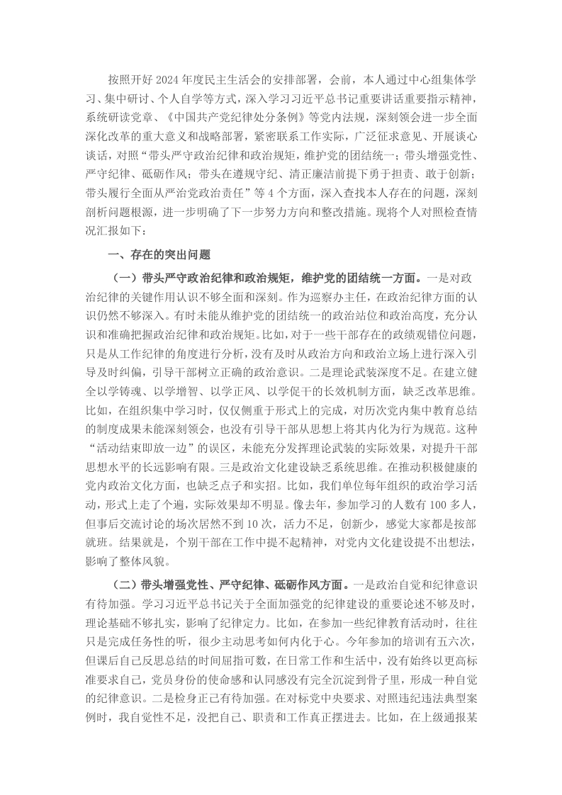 按照开好2024年度民主生活会的安排部署,会前,本人通过中心组集体学习、集中研讨、个人自学等方式,深入学习习近平总书记重要讲话重要指示精神,系统研读党章、《中国共产党纪律处分条例》等党内法规,深刻领会进一步全面深化改革的重大意义和战略部署,紧密联系工作实际,广泛征求意见、开展谈心谈话,对照“带头严守政治纪律和政治规矩,维护党的团结统一:带头增强党性、严守纪律、砥砺作风:带头在遵规守纪、清正廉洁前提下勇于担责、敢于创新:带头履行全面从严治党政治责任”等4个方面,深入查找本人存在的问题,深刻剖析问题根源,进一步明确了下一步努力方向和整改措施。现将个人对照检查情况汇报如下:一、存在的突出问题(一)带头严守政治纪律和政治规矩,维护党的团结统一方面。一是对政治纪律的关键作用认识不够全面和深刻。作为巡察办主任,在政治纪律方面的认识仍然不够深入。有时未能从维护党的团结统一的政治站位和政治高度,充分认识和准确把握政治纪律和政治规矩。比如,对于一些干部存在的政绩观错位问题,只是从工作纪律的角度进行分析,没有及时从政治方向和政治立场上进行深入引导及时纠偏,引导干部树立正确的政治意识。二是理论武装深度不足。在建立健全以学铸魂、以学增智、以学正风、以学促干的长效机制方面,缺乏改革思维。比如,在组织集中学习时,仅仅侧重于形式上的完成,对历次党内集中教育总结的制度成果未能深刻领会,也没有引导干部从思想上将其内化为行为规范。这种“活动结束即放一边”的误区,未能充分发挥理论武装的实际效果,对提升干部思想水平的长远影响有限。三是政治文化建设缺乏系统思维。在推动积极健康的党内政治文化方面,也缺乏点子和实招。比如,我们单位每年组织的政治学习活动,形式上走了个遍,实际效果却不明显。像去年,参加学习的人数有100多人,但事后交流讨论的场次居然不到10次,活力不足,创新少,感觉大家都是按部就班。结果就是,个别干部在工作中提不起精神,对党内文化建设提不出想法,影响了整体风貌。(二)带头增强党性、严守纪律、砥砺作风方面。一是政治自觉和纪律意识有待加强。学习习近平总书记关于全面加强党的纪律建设的重要论述不够及时,理论基础不够扎实,影响了纪律定力。比如,在参加一些纪律教育活动时,往往只是完成任务性的听,很少主动思考如何内化于心。今年参加的培训有五六次,但课后自己反思总结的时间屈指可数,在日常工作和生活中,没有始终以更高标准要求自己,党员身份的使命感和认同感没有完全沉淀到骨子里,形成一种自觉的纪律意识。二是检身正己有待加强。在对标党中央要求、对照违纪违法典型案例时,我自觉性不足,没把自己、职责和工作真正摆进去。比如,在上级通报某领导贪腐行为后,我虽然参与了讨论,但并没有深入剖析自身的风险点。像在我们科室,每年也进行项目资金审核,在审核过程中,我往往只是按部就班,而没有认真检查可能存在的隐患和漏洞。结果是,表面上规规矩矩,实质上脱离了细致的自我反思和改进,导致在提升道德境界和追求高尚情操方面的落实不够深入。三是引领和推动作用发挥不足。对生活纪律的条款内涵和重要作用理解不深,缺乏从提升干部理想信念和道德情操的政治高度去看待问题。比如,在与同事交流中,我更多专注于具体工作安排,而忽视了生活纪律的深层次教育。今年有过几次机会组织干部讨论个人发展与社会责任,对于引导他们思考社会道德风尚的努力不够。(三)带头在遵规守纪、清正廉洁前提下勇于担责、敢于创新方面。一是缺少抓好改革创新工作的辩证思维。自己在思想和观念上仍未完全适应新时代全面深化改革的高标准要求。思维较为固化,容易陷入推进改革创新与纪律建设风险加大的错误认知。例如,在推进巡察制度创新方面,总担心创新举措可能引发纪律风险,导致某些改革措施滞后,失去最佳落实时机。需要进一步增强新理念和新观念的接受与重塑速度,以更好推动巡察工作的高质量发展。二是缺乏“时时放心不下”的责任感和警觉性。在面对新形势下复杂多变的风险源时,自己没有时刻保持如履薄冰的谨慎和见叶知秋的敏锐。缺乏防范化解风险的前瞻性、预见性和针对性。例如,在处理某次突发巡察线索时,没有及时识别背后潜在的重大风险,导致问题积累,给后续工作增加了解决难度。需要进一步增强责任感和警觉性,以更主动有效地应对各种隐患和挑战。三是对基层减负工作的经验总结不够系统。在梳理总结基层减负工作的经验做法上,显得不够全面和系统。一些经过实践检验的有效做法,没有及时上升为制度规范。例如,在推动简化报告流程的过程中,虽解决了个别部门的效率问题,却未能将成功经验推广到其他相似领域,实现更大范围内的突破。(四)带头履行全面从严治党政治责任方面。一是推进改革与治党标准未能辩证统一。在推进改革和党的建设中,自身在看待和处理改革要求与治党标准时,方式方法不够辩证,观念也欠缺系统全面。具体来说,方法上不够灵活高效,制度建设上不够及时完备。例如,在绩效考核改革中,没有兼顾干部的积极性与纪律要求,导致部分干部创新动力不足。二是党性党风党纪统筹推进不够有力。在抓党性党风党纪工