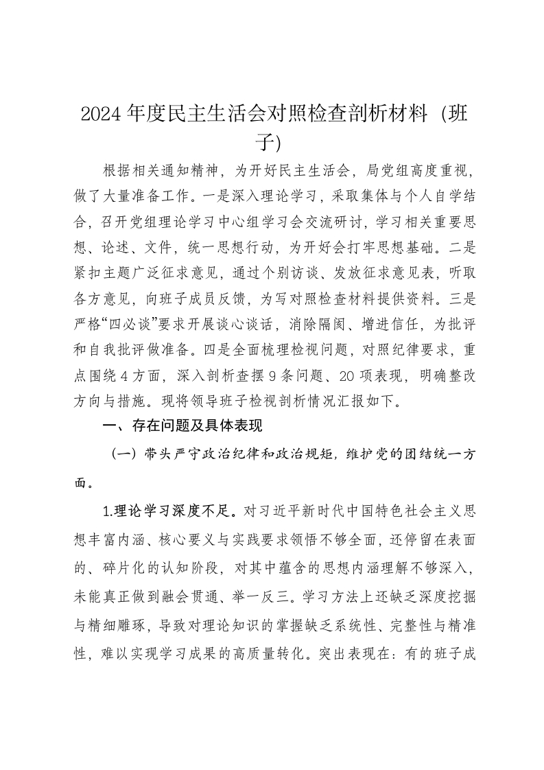 2024年度民主生活会对照检查剖析材料(班子)根据相关通知精神,为开好民主生活会,局党组高度重视,做了大量准备工作。一是深入理论学习,采取集体与个人自学结合,召开党组理论学习中心组学习会交流研讨,学习相关重要思想、论述、文件,统一思想行动,为开好会打牢思想基础。二是紧扣主题广泛征求意见,通过个别访谈、发放征求意见表,听取各方意见,向班子成员反馈,为写对照检查材料提供资料。三是严格“四必谈”要求开展谈心谈话,消除隔阂、增进信任,为批评和自我批评做准备。四是全面梳理检视问题,对照纪律要求,重点围绕4方面,深入剖析查摆9条问题、20项表现,明确整改方向与措施。现将领导班子检视剖析情况汇报如下。一、存在问题及具体表现(一)带头严守政治纪律和政治规矩,维护党的团结统一方面。1理论学习深度不足。对习近平新时代中国特色社会主义思想丰富内涵、核心要义与实践要求领悟不够全面,还停留在表面的、碎片化的认知阶段,对其中蕴含的思想内涵理解不够深入,未能真正做到融会贯通、举一反三。学习方法上还缺乏深度挖掘与精细雕琢,导致对理论知识的掌握缺乏系统性、完整性与精准性,难以实现学习成果的高质量转化。突出表现在:有的班子成员客观上忙于城市管理业务性工作多,理论学习投入精力不够,理论学习与业务工作开展不能很好协调,未能从党的创新理论中汲取精神力量,理论与实践相结合做得不到位,未能做到“学深悟透、学以致用”。有的班子成员对习近平总书记关于城市治理工作论述的领会还不深,对推动城市管理高质量发展缺少系统性的思考研究,对城市管理领域出现的难点和堵点缺乏深刻把握,导致城市管理领域一些老大难问题还没有得到根治。2.党性锤炼不够经常。有的班子成员平时忙于业务性工作,没有做到时时处处以党员的标准严格要求自已,未能从思想深处进行党性分析,未能经常从理想信念、宗旨意识、政治纪律和政治规矩等方面进行自我检视,未能将理论学习作为一种思想境界、一种精神追求和一种政治责任,对政治理论的学习自觉性不够。有的班子成员虽然能够在组织生活中按要求开展批评和自我批评,但在平时工作和生活中自我反省、自我监督不够,在坚持原则、敢于担当、勇于负责方面有差距。有的班子成员在党内政治生活中还没有完全做到知无不言、言无不尽,还没有完全将自己的思想和工作摆进去,还没有完全做到开诚布公地指出问题、提出建议,还没有完全做到推心置腹、坦诚相见。有的班子成员在日常工作中还存在一定的好人主义倾向,对个别同志的苗头性、倾向性问题,没有做到及时提醒、及时纠正,没有真正做到