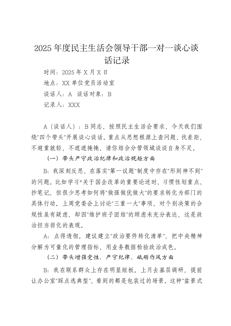 2025年度民主生活会领导干部一对一谈心谈话记录时间:2025年X月X日地点:X单位党员活动室谈话人:A谈话对象:B记录人:XXA(谈话人):B同志,按照民主生活会要求,今天我们围绕"四个带头"开展谈心谈话。重点从思想根源上查问题、找差距,不避重就轻,不遮遮掩掩,请你结合分管领域谈谈自身不足。(一)带头严守政治纪律和政治规矩方面B:我深刻反思,在落实"第一议题"制度中存在"形到神不到"的问题。比如学习*关于国企改革的重要论述时,习惯性划重点、抄笔记,但很少思考如何将"做强做优做大"的要求转化为部门的具体行动。上周党委会上讨论"三重一大"事项,对个别决策的合规性虽有疑虑,却因"维护班子团结"的顾虑未充分表达,这是政治担当弱化的表现。A:点得透彻。建议建立"政治要件转化清单",把中央精神分解为可量化的管理指标,用业务数据检验政治成色。(二)带头增强党性、严守纪律、砥砺作风方面B:我在联系群众上存在明显短板。上月去基层调研,提前让办公室"踩点选典型”,看到的都是包装过的场景。这种"盆景式调研"背离了实事求是原则,根子上是官僚主义作祟。警示教育片中那个弄虚作假的干部,就是从"选择性失明"开始堕落的,这给我敲响了警钟。A:作风问题具有顽固性。建议推行“四不两直”调研法(不发通知、不打招呼、不听汇报、不用陪同,直奔基层、直插现场),让脚底沾泥、心中有数。(三)带头在遵规守纪、清正廉洁前提下勇于担责、敢于创新方面B:分管部门存在"躺平式"苗头,我负有领导责任。比如推行数字化办公时,部分老同志有抵触情绪,我担心激化矛盾,仅以"尊重个体差异"为由放任自流。这看似”人性化管理”,实则是缺乏斗争精神,把"守摊子"当成了"保稳定"。A:破题需要智慧。建议开展"银发先锋"行动,让老同志牵头传统工艺传承项目,在价值重塑中实现观念转变。(四)带头履行全面从严治党政治责任方面B:对分管科室的廉政教育存在"雨过地皮湿"现象。比如廉政谈话多讲"禁止收礼"等显性问题,对"软腐败"风险提醒不足,警示教育针对性不强。A:腐败变异升级,监督必须与时俱进,用情景案例教学提升识别"温情陷阱"的能力。(五)围绕本领域违纪行为典型案例剖析B:近期通报的某央企"靠企吃企"案例让我深受震动。虽然