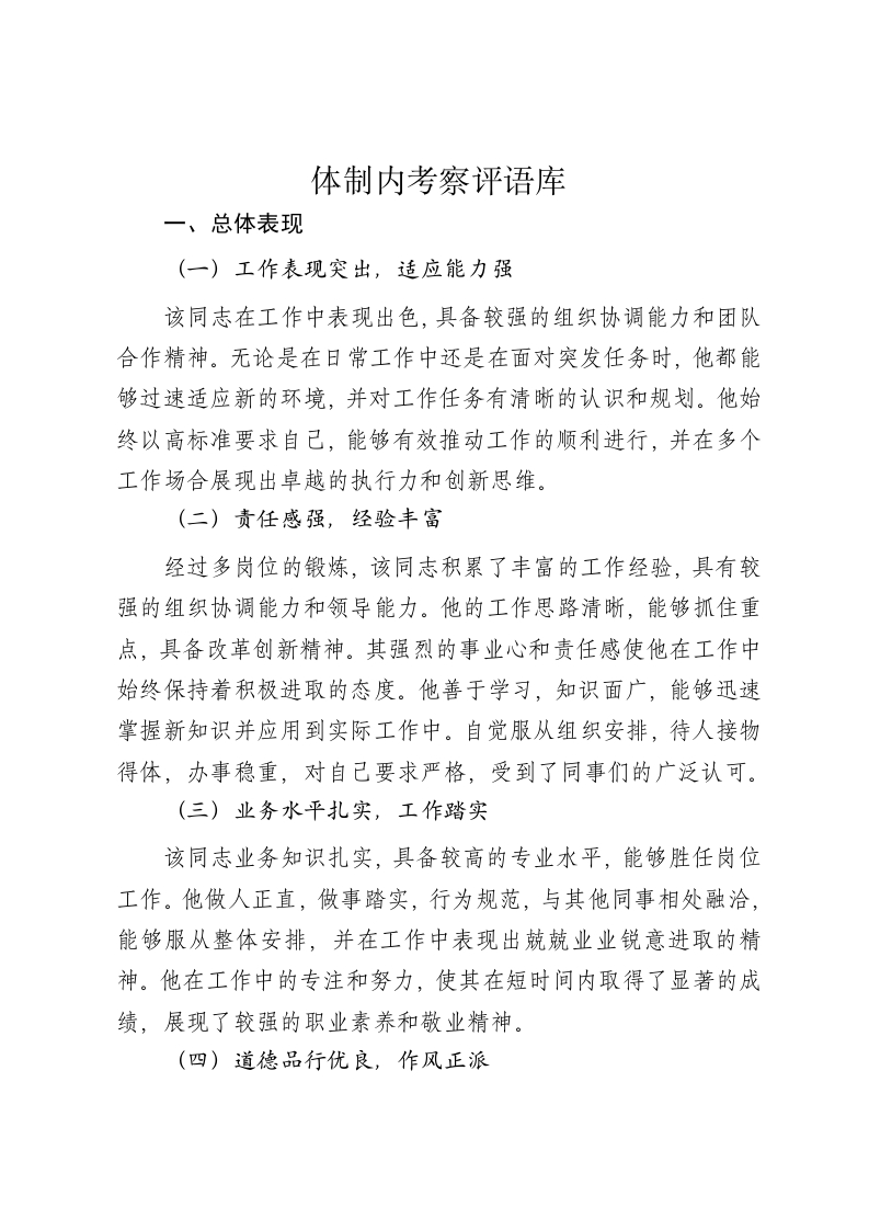 体制内考察评语库一、总体表现(一)工作表现突出,适应能力强该同志在工作中表现出色,具备较强的组织协调能力和团队合作精神。无论是在日常工作中还是在面对突发任务时,他都能够过速适应新的环境,并对工作任务有清晰的认识和规划。他始终以高标准要求自己,能够有效推动工作的顺利进行,并在多个工作场合展现出卓越的执行力和创新思维。(二)责任感强,经验丰富经过多岗位的锻炼,该同志积累了丰富的工作经验,具有较强的组织协调能力和领导能力。他的工作思路清晰,能够抓住重点,具备改革创新精神。其强烈的事业心和责任感使他在工作中始终保持着积极进取的态度。他善于学习,知识面广,能够迅速掌握新知识并应用到实际工作中。自觉服从组织安排,待人接物得体,办事稳重,对自己要求严格,受到了同事们的广泛认可。(三)业务水平扎实,工作踏实该同志业务知识扎实,具备较高的专业水平,能够胜任岗位工作。他做人正直,做事踏实,行为规范,与其他同事相处融洽,能够服从整体安排,并在工作中表现出兢兢业业锐意进取的精神。他在工作中的专注和努力,使其在短时间内取得了显著的成绩,展现了较强的职业素养和敬业精神。(四)道德品行优良,作风正派该同志始终保持高尚的道德情操,工作作风正派。他在面对工作和事业时,能够顾全大局,不争名夺利,不计较个人得失,始终保持着良好的道德风尚。他以身作则,严格要求自己,受到XX的高度评价和同事们的普遍赞誉。二、工作能力(一)专业能力强,创新意识突出该同志在业务能力方面表现突出,对专业领域有深入的理解和独到的见解。他能够独立完成复杂的工作任务,并在关键时刻提出建设性意见,工作质量和效率得到了大家的高度认可。他的创新意识强,能够在工作中大胆尝试新的方法,推动工作不断向前发展。(二)工作思路清晰,领导能力卓越该同志工作有条理,思路清晰,能够站在全局的高度考虑问题。作风泼辣,敢于担当,能够有效推动工作。他的领导能力得到了大家的广泛认可,善于抓班子带队伍,自身作风正派,以身作则,展现了较强的驾驭全局能力。(三)执行力强,模范带头作用突出该同志工作认真扎实,责任心强,能够一丝不苟地完成各项任务。他对自已要求严格,干净干事,能够在工作中起到模范带头作用。他踏实肯干,吃苦耐劳,敬业精神强,能够迅速进入工作角色,展现了优秀的职业素养(四)善于处理复杂问题,推动工作成效显著
