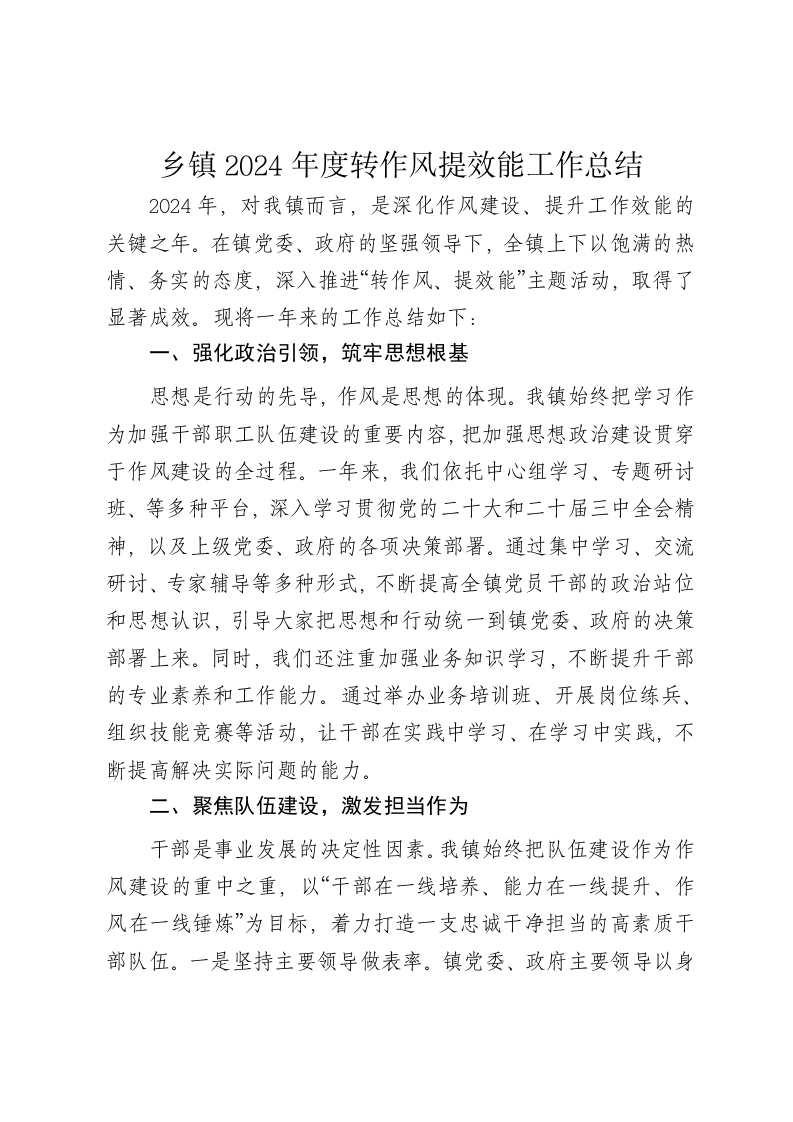 乡镇2024年度转作风提效能工作总结2024年,对我镇而言,是深化作风建设、提升工作效能的关键之年。在镇党委、政府的坚强领导下,全镇上下以饱满的热情、务实的态度,深入推进“转作风、提效能”主题活动,取得了显著成效。现将一年来的工作总结如下:一、强化政治引领,筑牢思想根基思想是行动的先导,作风是思想的体现。我镇始终把学习作为加强干部职工队伍建设的重要内容,把加强思想政治建设贯穿于作风建设的全过程。一年来,我们依托中心组学习、专题研讨班、等多种平台,深入学习贯彻党的二十大和二十届三中全会精神,以及上级党委、政府的各项决策部署。通过集中学习、交流研讨、专家辅导等多种形式,不断提高全镇党员干部的政治站位和思想认识,引导大家把思想和行动统一到镇党委、政府的决策部署上来。同时,我们还注重加强业务知识学习,不断提升干部的专业素养和工作能力。通过举办业务培训班、开展岗位练兵、组织技能竞赛等活动,让干部在实践中学习、在学习中实践,不断提高解决实际问题的能力。二、聚焦队伍建设,激发担当作为干部是事业发展的决定性因素。我镇始终把队伍建设作为作风建设的重中之重,以“干部在一线培养、能力在一线提升、作风在一线锤炼”为目标,着力打造一支忠诚干净担当的高素质干部队伍。一是坚持主要领导做表率。镇党委、政府主要领导以身作则、率先垂范,无论是推进重点工作还是解决难点问题,都冲锋在前、勇挑重担,为全镇党员干部树立了榜样。二是注重党员干部带好头。我们充分发挥党员干部的先锋模范作用,通过设立党员先锋岗、组建党员突击队等形式,引导党员干部在急难险重任务面前勇挑重担、冲锋陷阵。同时,我们还注重加强党员干部的日常管理和监督,通过定期开展谈心谈话、民主评议党员等活动,及时了解党员干部的思想动态和工作表现,对存在的问题及时提醒、督促整改。三是强化中层干部挑重担。我们注重选拔那些政治坚定、作风过硬、能力突出的中层干部担任重要职务,让他们在工作中挑大梁、唱主角。同时,我们还建立了中层干部绩效考核机制,通过定期考核、评先选优等方式,激励中层干部不断进取、创先争优。在队伍建设中,我们还严格落实“十有”工作法,即“有目标、有计划、有措施、有进度、有检查、有反馈、有整改、有提升、有成效、有经验”,把工作任务项目化、清单化、责任化,明确职责、严抓落实,确保各项工作按时保质保量完成。三、优化服务流程,提升工作效能效能是作风建设的直接体现。我镇始终把提升工作效能作为作风建设的出发点和落脚点,通过优化服务流程、创新工作机制、加强信息化建设等措施,不断提高为民服务的质量和效率。一是优化服务流程。我们针对群众办事过程中存在的“门难进、脸难看、事难办”等问题,对镇便民服务中心进行了全面改造升级,