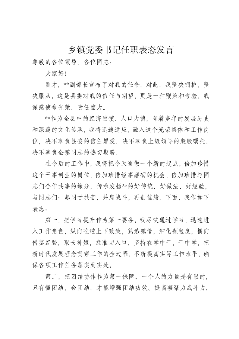 乡镇党委书记任职表态发言尊敬的各位领导,各位同志:大家好!刚才,*副部长宣布了对我的任命,对此,我坚决拥护、坚决服从。这是县委对我的信任与期望,更是一种鞭策和考验,我深感使命光荣、责任重大。*作为全县中的经济重镇、人口大镇,有着多年的发展历史和深邃的文化传承,我将迅速适应、融入这个光荣集体和工作岗位,决不辜负县委的信任厚爱、决不辜负上级领导的殷殷嘱托、决不辜负全镇同志的热切期盼。在今后的工作中,我将把今天当做一个新的起点,倍加珍惜这个干事创业的岗位,倍加珍惜经事磨砺的机会,倍加珍惜与同志们合作共事的缘分,传承发扬*的好传统、好做法、好经验,与同志们一起同甘共苦,并肩战斗,再创佳绩。下面,我作如下表态:第一,把学习提升作为第一要务。我尽快通过学习,迅速进入工作角色,纵向吃透上下政策,熟悉镇情,细化颗粒度;横向借鉴经验,取长补短,找准切入口。坚持在学中干,干中学,把新时代发展理念贯穿工作的全过程,不断提高实际工作水平,确保各项工作任务落实到实处。第二,把团结协作作为第一保障。一个人的力量是有限的,只有懂团结、会团结,才能增强团结功效、提高凝聚力战斗力。作为班长,我将发扬“众人拾柴火焰高”的团结精神,多向同事“取经问道”,在民主集中、取长补短、互相提高的过程中促进团结协作。同时要相互支持帮助、理解包容,共同解决问题。第三,把真抓实干作为第一遵循。只有具备强烈责任感,才能敢抓敢干,敢于打破常规、敢于争先领跑,真正“把初心落在行动上、把使命担在肩膀上,在其职尽其责,主动担当、积极作为。坚持做到脚踏实地、久久为功,不好高骛远、不脱离实际,以真抓的实劲、敢抓的狠劲、善抓的巧劲,多为民解难,为党分忧。第四,把廉洁自律作为第一准则。我将始终坚守底线、不碰红线,做到清正廉洁、公道正派。自觉接受群众和同事监督,遵守各项规定,老老实实做人,勤勤恳恳干事,清清白白任职,时刻保持清醒头脑,处处严格要求自我,认真履行全面从严治党“第一责任人”职责,把党风廉政建设和信访工作同部署、同落实、同推进。各位领导、同事们,站在新的起点上,我将以更加饱满的热情、更加务实的作风、更加有力的措施,为群众办实事、办好事。我相信,在大家的关心支持下,我一定能够不负重托、不辱使命,为推动*高质量发展做出更大的贡献!谢谢大家!