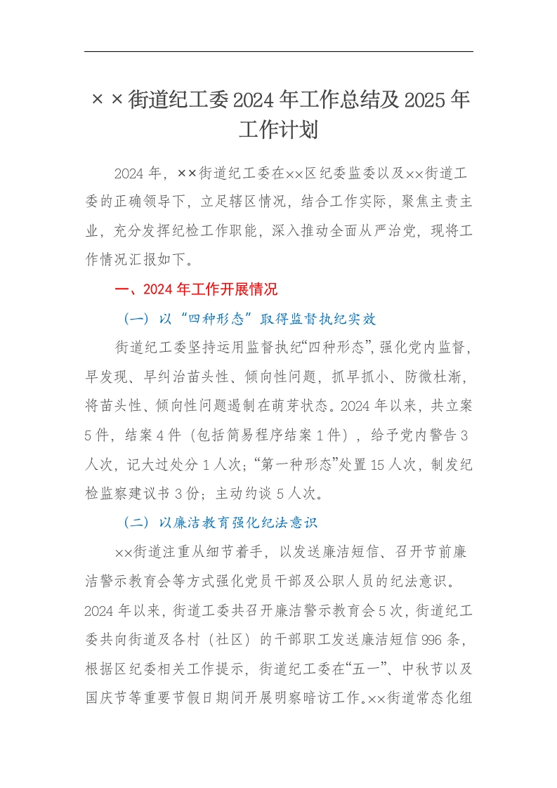××街道纪工委2024年工作总结及2025年工作计划2024年,××街道纪工委在××区纪委监委以及××街道工委的正确领导下,立足辖区情况,结合工作实际,聚焦主责主业,充分发挥纪检工作职能,深入推动全面从严治党,现将工作情况汇报如下。一、2024年工作开展情况(一)以“四种形态”取得监督执纪实效街道纪工委坚持运用监督执纪“四种形态”,强化党内监督,早发现、早纠治苗头性、倾向性问题,抓早抓小、防微杜渐,将苗头性、倾向性问题遏制在萌芽状态。2024年以来,共立案5件,结案4件(包括简易程序结案1件),给予党内警告3人次,记大过处分1人次;“第一种形态”处置15人次,制发纪检监察建议书3份;主动约谈5人次。(二)以廉洁教育强化纪法意识××街道注重从细节着手,以发送廉洁短信、召开节前廉洁警示教育会等方式强化党员干部及公职人员的纪法意识。2024年以来,街道工委共召开廉洁警示教育会5次,街道纪工委共向街道及各村(社区)的干部职工发送廉洁短信996条,根据区纪委相关工作提示,街道纪工委在“五一”、中秋节以及国庆节等重要节假日期间开展明察暗访工作。××街道常态化组织学习《中国共产党纪律处分条例》等党纪党规、二十届中央纪委三次全会精神等重要会议精神及重要指示精神,强化廉洁教育。(三)以专项整治落实专项监督为深入贯彻落实二十届中央纪委三次全会精神、中央八项规定精神,根据××纪委监委关于各类专项整治的文件要求及指示精神,×街道聚焦违规吃喝专项整治、群众身边不正之风和腐败问题等方面,开展自查自纠等相关工作,坚持有问题抓整治、没问题抓预防,确保整治工作落到实处,取得实效。此外,街道纪工委强化政治监督职责,以政治监督清单为抓手,督促街道各部门把相关工作落到实处。二、亮点经验聚焦农村集体“三资”管理,规范小微权力运行。农村集体“三资”管理的制度化、规范化是实现“三资”保值增值、防止“三资”流失、保障群众合法权益的重要举措。街道纪工委书记带领办事处相关工作人员及8个村委开展“五清五规范”工作,摸清底数,查摆问题,进一步规范农村集体“三资”管理,切实维护群众切身利益,激发村集体经济活力。三、存在问题(一)农村集体“三资”监管是一项即复杂又艰巨的系统性工作,稍有不慎,会损害到群众的切身利益,给农村集体经济的发展造成不良影响。省尚未对农村集体经济组织的成员确