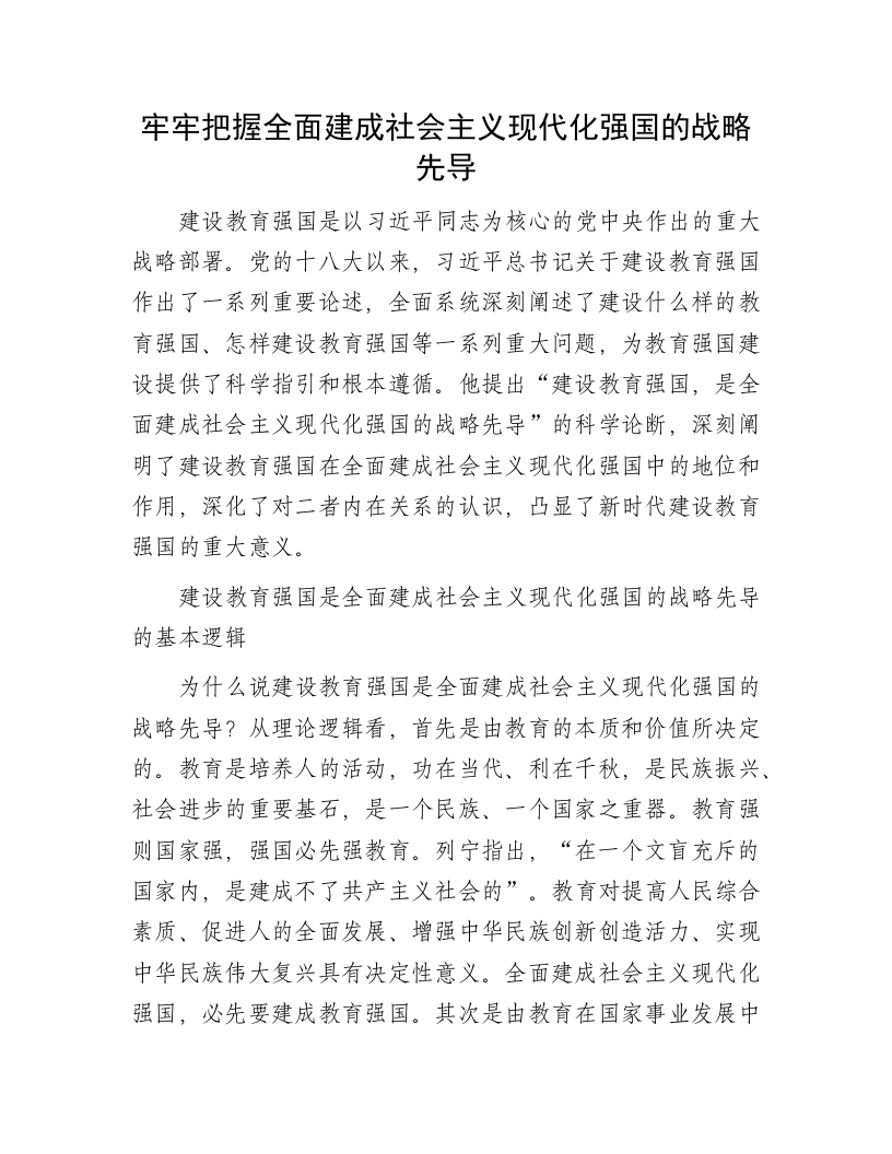 牢牢把握全面建成社会主义现代化强国的战略先导建设教育强国是以习近平同志为核心的党中央作出的重大战略部署。党的十八大以来,习近平总书记关于建设教育强国作出了一系列重要论述,全面系统深刻阐述了建设什么样的教育强国、怎样建设教育强国等一系列重大问题,为教育强国建设提供了科学指引和根本遵循。他提出“建设教育强国,是全面建成社会主义现代化强国的战略先导”的科学论断,深刻阐明了建设教育强国在全面建成社会主义现代化强国中的地位和作用,深化了对二者内在关系的认识,凸显了新时代建设教育强国的重大意义。建设教育强国是全面建成社会主义现代化强国的战略先导的基本逻辑为什么说建设教育强国是全面建成社会主义现代化强国的战略先导?从理论逻辑看,首先是由教育的本质和价值所决定的。教育是培养人的活动,功在当代、利在千秋,是民族振兴,社会进步的重要基石,是一个民族、一个国家之重器。教育强则国家强,强国必先强教育。列宁指出,“在一个文盲充斥的国家内,是建成不了共产主义社会的”。教育对提高人民综合素质、促进人的全面发展、增强中华民族创新创造活力、实现中华民族伟大复兴具有决定性意义。全面建成社会主义现代化强国,必先要建成教育强国。其次是由教育在国家事业发展中的基础性、先导性和全局性地位和作用所决定的。教育发展与科技进步、经济社会发展具有内在一致性,教育通过提高全民文化素质、培养各级各类人才、生产和传播知识,提升社会文明程度、推动科技创新发展和科技成果转化与应用,提高生产力水平和促进经济繁荣发展,进而支撑和引领国家各项事业的全面进步。在科技为第一生产力、人才为第一资源、创新为第一动力的当今时代,教育、科技、人才是全面建设社会主义现代化国家的基础性、战略性支撑,教育又是科技进步、人才发展的基础。从实践逻辑看,世界强国无一不是教育强国。中华民族迎来了从站起来、富起来到强起来的伟大飞跃,与我国由文盲半文盲大国到教育大国、迈向教育强国,从人口大国到人力资源大国、迈向人力资源强国的转变是密不可分的。所以,由教育强国到科技强国、人才强国再到其他强国目标的实现,最终到全面建成社会主义现代化强国,就构成了发展的逻辑。加快建设教育强国是新时代全面建成社会主义现代化强国的一项重大而紧迫的战略任务党的二十大擘画了新时代全面建成社会主义现代化强国的宏伟蓝图,提出了全面建成社会主义现代化强国、实现第二个百年奋斗目标,以中国式现代化全面推进中华民族伟大复兴的党的中心任务,统筹布局教育、科技、人才,对建设教育强国作出了全面部署,提出到2035年建成教育强国。任重道远,时不我待。当今世界形势风云变幻、云谲波诡,百年未有之大