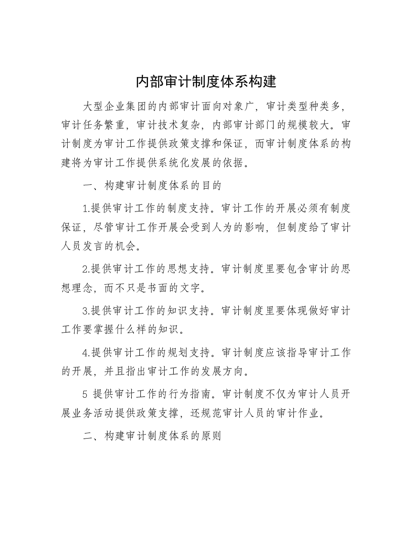 内部审计制度体系构建大型企业集团的内部审计面向对象广,审计类型种类多,审计任务繁重,审计技术复杂,内部审计部门的规模较大。审计制度为审计工作提供政策支撑和保证,而审计制度体系的构建将为审计工作提供系统化发展的依据。一、构建审计制度体系的目的1.提供审计工作的制度支持。审计工作的开展必须有制度保证,尽管审计工作开展会受到人为的影响,但制度给了审计人员发言的机会。2提供审计工作的思想支持。审计制度里要包含审计的思想理念,而不只是书面的文字。3.提供审计工作的知识支持。审计制度里要体现做好审计工作要掌握什么样的知识。4.提供审计工作的规划支持。审计制度应该指导审计工作的开展,并且指出审计工作的发展方向。5提供审计工作的行为指南。审计制度不仅为审计人员开展业务活动提供政策支撑,还规范审计人员的审计作业。二、构建审计制度体系的原则1.前瞻性。审计制度体系应该能较为准确地预测到审计工作未来的发展方向。即使目前因为客观条件开展不了的审计业务,也可能要体现在审计制度体系中。2.开放性。审计制度体系应该能允许进一步完善、补充或者调整,能够吸收最新的外部政策、制度、规定。3,适用性。审计制度体系应该适用于本企业组织的发展状况,而不是照搬行业或国家的规章。4.权威性。审计制度一经制定,不能轻易修改,总部及下属单位的审计人员就要遵守执行。5.指导性。审计制度能够指导审计人员对审计工作正确的理解,为审计人员提供方向性的指南。三、审计制度分类1.按适用的层面分:公司类、部门类、员工类。公司类的制度可以有审计章程等,部门类的制度可以有审计部门日常管理办法等,员工类的制度可以有审计人员绩效考核办法等。2按实现的功能划分:原则类、规则类、操作类。原则类的制度可以有内部审计准则等,规则类的制度可以有审计实务标准等,操作类的制度可以作业指引等。3按更新时间的长短:长期类、中期类、短期类。长期类的制度可以是审计准则等,中期类的制度可以是审计实务标准等,短期类的可以是审计手册等。