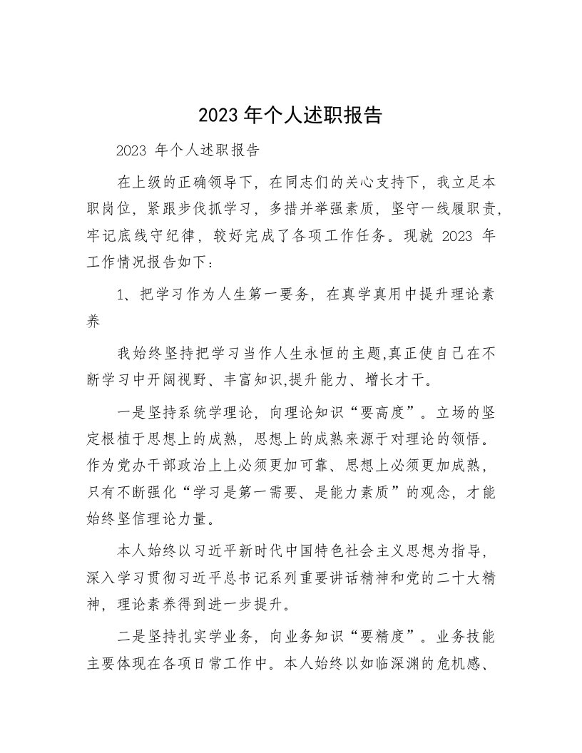 2023年个人述职报告2023年个人述职报告在上级的正确领导下,在同志们的关心支持下,我立足本职岗位,紧跟步伐抓学习,多措并举强素质,坚守一线履职责,牢记底线守纪律,较好完成了各项工作任务。现就2023年工作情况报告如下:1、把学习作为人生第一要务,在真学真用中提升理论素养我始终坚持把学习当作人生永恒的主题,真正使自己在不断学习中开阔视野、丰富知识,提升能力、增长才干。一是坚持系统学理论,向理论知识“要高度”。立场的坚定根植于思想上的成熟,思想上的成熟来源于对理论的领悟。作为党办干部政治上上必须更加可靠、思想上必须更加成熟,只有不断强化“学习是第一需要、是能力素质”的观念,才能始终坚信理论力量。本人始终以习近平新时代中国特色社会主义思想为指导,深入学习贯彻习近平总书记系列重要讲话精神和党的二十大精神,理论素养得到进一步提升。二是坚持扎实学业务,向业务知识“要精度”。业务技能主要体现在各项日常工作中。本人始终以如临深渊的危机感、如坐针毡的紧迫感、舍我其谁的责任感加强业务知识学习、注重实践锻炼。平时能主动学习法律、财务、预算、造价等相关业务知识,特别是修订后的一系列工作制度,熟练掌握财务管理、公务采购、车辆管理等专业领域知识,管理水平渐趋专业,高效保障了后勤服务工作运转。三是坚持全面学文化,向文化知识“要广度”。作为党办人,不仅要有敏锐的观察分析能力和严谨的思维判断能力,还要有较强的协调能力和表达能力,这些都必须要有广博的知识作支撑。本人在“党办书屋”先后借阅了历史、经济、文学、哲学、人文科学等书籍,努力在刻苦学习中提高文化水平,在日积月累中丰富知识阅历。2、把岗位作为实现价值平台,在勤奋敬业中提升素质本领本职岗位是履行使命的主阵地,是成长成才的大舞台,是练就过硬本领的好平台。本人坚持以强烈的担当意识和勤奋的敬业精神,在本职岗位中认真履好职、尽好责。一是立足职务谋事。“凡事预则立,不预则废”。谋事就是要勤于学习、练就内功,善于用全局的视野、战略的眼光、创新的思路来思考问题、谋划工作。坚持科学的工作方法,善于从大处着眼、从小事做起,找准工作切入点,做到方向明确、目标细化、标准量化、要求严厉、制度严格,力求每项工作都做到精细。