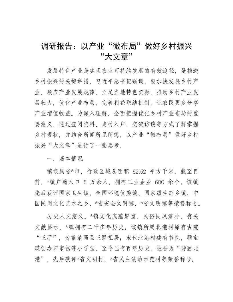 调研报告:以产业“微布局”做好乡村振兴“大文章”发展特色产业是实现农业可持续发展的有效途径,是推进乡村振兴的关键举措。习近平总书记强调,要加快发展乡村产业,顺应产业发展规律,立足当地特色资源,推动乡村产业发展壮大,优化产业布局,完善利益联结机制,让农民更多分享产业增值收益。为深入理解、全面把握优化乡村产业布局的重要意义,通过查阅资料、走村入户、交流访谈等方式了解掌握乡村现状,并结合所闻所见所想,以产业“微布局”做好乡村振兴“大文章”进行了一些思考。一、基本情况镇隶属省*市,行政区域总面积62.52平方千米。截至目前,*镇户籍人口5万余人,拥有工业企业600余个。该镇先后获评国家卫生镇、全国环境优美镇、国家级生态乡镇、中国民间文化艺术之乡、*省安全文明镇、*省文明镇等荣誉称号。历史人文悠久。*镇文化底蕴厚重,民俗民风淳朴。有关文献显示,*镇拥有二千多年历史。该镇所属北港村原有古院“王厅”,为前清画圣王翚祖居;宋代北港村建有书院,顾宝瑛创办归市初等小学堂,至今已有百年历史,被誉为“诗画北港”,先后获评*省文明村、*省民主法治示范村等荣誉称号。生态环境优越。镇建成具有鲜明江南水乡特色的省级乡村湿地公园泥仓一一溇湿地公园,总面积130公顷,湿地率达81.1%。公园通过生态湿地营造、农村污水集中处理、农业尾水生态净化处理、美丽村庄建设、湿地社区营建等多方面提升,挖掘本地独特的乡土文化和湿地资源,成为将传统乡村社区建设与农耕湿地保护及合理利用相结合的示范窗口。农特产品优质。着力打造“*乡情十二品”区域农业品牌,以“母子品牌”联合运作,下辖的“黄金小玉米”叶黄素含量超过同类玉米40%以上,获评国家农产品地理标志认证,在国内深受欢迎;下辖的“筒管玉丝瓜”果实色泽翠绿、味道鲜美,获评*省名牌产品,成为市首个获得中国地理标志认证商标,并通过国家农产品地理标志认证。二、实践做法近年来,*镇通过优化产业布局,积极以特色农产业带动乡村经济发展,切实描绘出“农民富、农业强、农村美”新画卷。品牌建设让“小食”变“美食”。2017年以前,“黄金小玉米”只是一个特色“乡土小食”,影响不大、名气不响。2020年,“*黄金小玉米”成功获得国家农产品地理标志证书。*镇抓住机遇,通过品质提优,推动农业品牌产业建设,探索出了一条以政府精准引导、龙头企业联动销售、农户安心种植的地方特色农产品产业发展新路径。从育种到销售,“*黄金