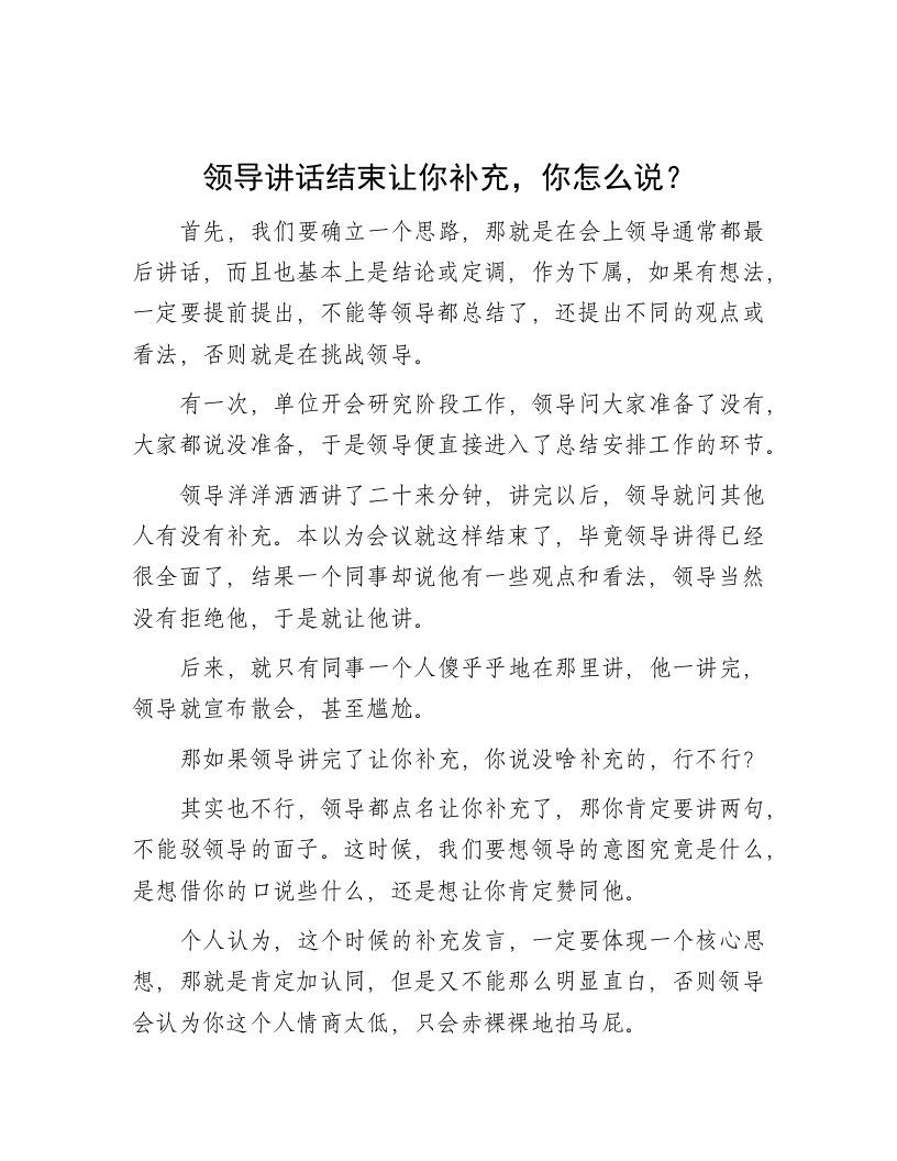 领导讲话结束让你补充,你怎么说?首先,我们要确立一个思路,那就是在会上领导通常都最后讲话,而且也基本上是结论或定调,作为下属,如果有想法,一定要提前提出,不能等领导都总结了,还提出不同的观点或看法,否则就是在挑战领导。有一次,单位开会研究阶段工作,领导问大家准备了没有,大家都说没准备,于是领导便直接进入了总结安排工作的环节。领导洋洋洒洒讲了二十来分钟,讲完以后,领导就问其他人有没有补充。本以为会议就这样结束了,毕竟领导讲得已经很全面了,结果一个同事却说他有一些观点和看法,领导当然没有拒绝他,于是就让他讲。后来,就只有同事一个人傻乎乎地在那里讲,他一讲完,领导就宣布散会,甚至尴尬。那如果领导讲完了让你补充,你说没啥补充的,行不行?其实也不行,领导都点名让你补充了,那你肯定要讲两句,不能驳领导的面子。这时候,我们要想领导的意图究竟是什么,是想借你的口说些什么,还是想让你肯定赞同他。个人认为,这个时候的补充发言,一定要体现一个核心思想,那就是肯定加认同,但是又不能那么明显直白,否则领导会认为你这个人情商太低,只会赤裸裸地拍马屁。你可以这样说:“领导刚才的讲话,给了我很多启发,也帮我理清了下一个阶段的工作思路。尤其是领导讲到的X问题,一针见血地指出了矛盾所在,让人受益匪浅。另外,关于落实好此次会议精神,我计划…”这样一讲,格调马上就上来了,是个领导听完以后,都会觉得你情商高,有两把刷子。