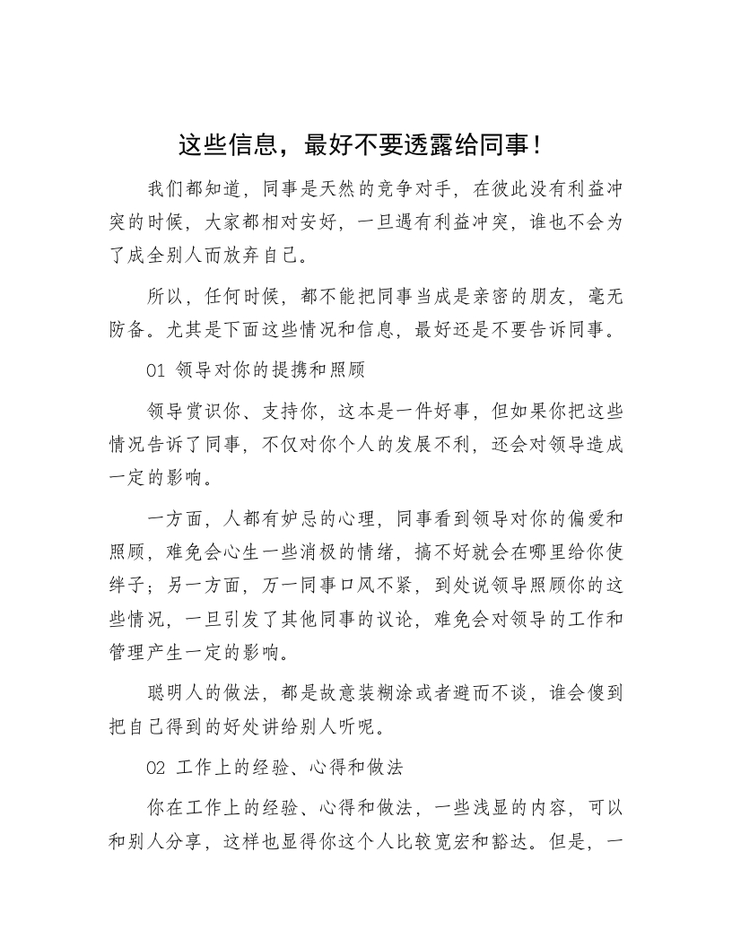这些信息,最好不要透露给同事!我们都知道,同事是天然的竞争对手,在彼此没有利益冲突的时候,大家都相对安好,一旦遇有利益冲突,谁也不会为了成全别人而放弃自己。所以,任何时候,都不能把同事当成是亲密的朋友,毫无防备。尤其是下面这些情况和信息,最好还是不要告诉同事。01领导对你的提携和照顾领导赏识你、支持你,这本是一件好事,但如果你把这些情况告诉了同事,不仅对你个人的发展不利,还会对领导造成一定的影响。一方面,人都有妒忌的心理,同事看到领导对你的偏爱和照顾,难免会心生一些消极的情绪,搞不好就会在哪里给你使绊子;另一方面,万一同事口风不紧,到处说领导照顾你的这些情况,一旦引发了其他同事的议论,难免会对领导的工作和管理产生一定的影响。聪明人的做法,都是故意装糊涂或者避而不谈,谁会傻到把自己得到的好处讲给别人听呢。02工作上的经验、心得和做法你在工作上的经验、心得和做法,一些浅显的内容,可以和别人分享,这样也显得你这个人比较宽宏和豁达。但是,一些比较宝贵和珍稀的内容,还是保留比较好,因为大家都知道了、都学会了,你的优势和相互竞争力就没有了。我们都知道,在职场上,一定要有一些不一样的地方,一定要长远构建自己的核心竞争力。毕竟自己素质过硬或不可或缺了,比啥都管用。所以,面对别人的讨教,一定要遏制自己好为人师的想法和情绪,还是多留个心眼比较好。03你遭受的委屈或不公平对待职场讲究的是价值和利益的交换,而不是所谓的情感或对错,谁能创造价值,谁就是优秀员工,谁能贡献利益,谁就是栋梁之材。再说了,人都有欺软怕硬和幸灾乐祸的心理,你把自己遭受的委屈和不公平待遇告诉同事,你以为同时会理解你、同情你,但实际上大多数同事并不怎么关心,即便关心你,也不见得是真的理解和同情你,搞不好还是表面一套背后一套,在心里面看你的笑话呢。要知道,人生的很多苦难,都是需要我们独自忍受和消化的,别人关心的只有他们自己。04你拥有的背景、关系和人脉