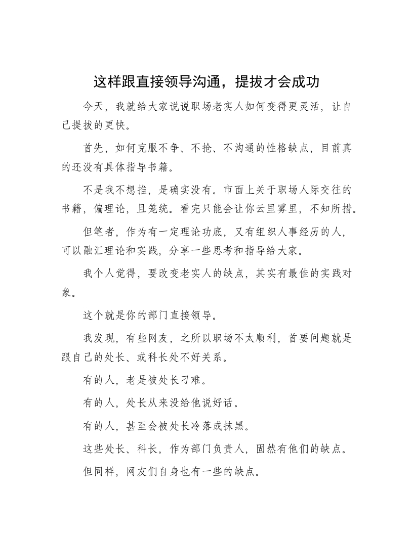 这样跟直接领导沟通,提拔才会成功今天,我就给大家说说职场老实人如何变得更灵活,让自己提拔的更快。首先,如何克服不争、不抢、不沟通的性格缺点,目前真的还没有具体指导书籍。不是我不想推,是确实没有。市面上关于职场人际交往的书籍,偏理论,且笼统。看完只能会让你云里雾里,不知所措。但笔者,作为有一定理论功底,又有组织人事经历的人,可以融汇理论和实践,分享一些思考和指导给大家。我个人觉得,要改变老实人的缺点,其实有最佳的实践对象。这个就是你的部门直接领导。我发现,有些网友,之所以职场不太顺利,首要问题就是跟自己的处长、或科长处不好关系。有的人,老是被处长刁难。有的人,处长从来没给他说好话。有的人,甚至会被处长冷落或抹黑。这些处长、科长,作为部门负责人,固然有他们的缺点。但同样,网友们自身也有一些的缺点。首先,就是思考问题只是从自己角度出发,很少从直接领导角度出发。比如,一项工作任务,处长让你这样做,你觉得处长没有道理,提出了自己的意见。然而,处长也觉得你没有道理,让你按原来的方法做。你非得坚持自己的意见,让处长感觉沟通特费劲,认为你是个特别轴的人。一些老实人,虽然干工作认真,但平时工作很轴。让直接领导很不舒服。导致直接领导觉得你有意抬杠。其次,除了业务工作,不懂得跟直接领导进行情感交流。有些人,工作认真,任务也完成的不错。但在跟领导私人交往方面,做得不够。比如,很少找科长聊天。大家千万不要小看这个私人聊天。其实,通过这个私人聊天,可以左右科长的想法。聊聊工作、家常、生活、孩子,会让你和科长的关系迅速升温拉近。你可以在聊天中关心科长的工作感受,为他分担忧愁和焦虑。