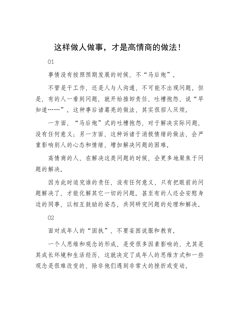 这样做人做事,才是高情商的做法!01事情没有按照预期发展的时候,不“马后炮”。不管是干工作,还是人与人沟通,不可能不出现问题。但是,有的人一看到问题,就开始推卸责任、吐槽抱怨,说“早知道…”。这种事后诸葛亮的做法,其实很招人厌烦。一方面,“马后炮”式的吐槽抱怨,对于解决实际问题,没有任何意义另一方面,这种诉诸于消极情绪的做法,会严重影响别人的心态和情绪,增加解决问题的困难。高情商的人,在解决这类问题的时候,会更多地聚焦于问题的解决。因为此时追究谁的责任,没有任何意义,只有把眼前的问题解决了,才能化解其它一切的问题。甚至有的人还会安慰身边的同事,以相互鼓励的姿态,共同研究问题的处理和解决。02面对成年人的“固执”,不要妄图说服和教育。一个人思维和观念的形成,是受很多因素影响的,尤其是其成长环境和生活经历,这就决定了成年人的思维方式和一些观念是很难改变的,除非他们遇到非常大的挫折或变动。所以,与成年人交往,最好的方式就是求同存异,而不是妄图影响或者改变别人。网上有句话说得很通俗:“成年人的世界,只能筛选,而不能教育。”意思不是说成年人完全不能改变,而是相对于改变,顺应别人的个性和特点做事,会更能促进彼此的共赢。举个例子。作为领导,在管理下属的时候,就不能太过于理想化,试图以所谓的理念引领下属,而应该站在下属的角度,提前为下属考到前途和收益,这样下属才会卖力地干活。03水深流缓,人贵语迟,说话最好慢上三秒钟。曾仕强老师的一句话,我觉得很受用,那就是刺激过来的时候,一定要把嘴巴闭起来,否则事后肯定是要后悔的,甚至还会吃亏倒霉。记得有一次,上级领导刚强调完一件事情,我就习惯性地发表了一些评论,而且还是那种“反调”的评论。事后我就挺后悔,心想如果这话传到了上级领导那里,会怎么想我和看我。很多事情刚过来的时候,我们并不能看到事情的全貌,这时候如果贸然发表评论或看法,就难免会出现纰漏。最明智的做法,就是静观其变,让别人说,听别人说,而不是自己说。事实上,越是说话慢半拍的人,越是聪明和智慧,因为他们知道话这个东西越慢越少越好。