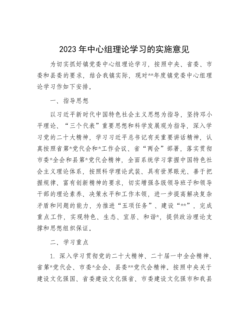 2023年中心组理论学习的实施意见为切实抓好镇党委中心组理论学习,按照中央、省委、市委和县委的要求,结合我镇实际,现对*年度镇党委中心组理论学习作如下安排。一、指导思想以习近平新时代中国特色社会主义思想为指导,坚持邓小平理论、“三个代表”重要思想和科学发展观为指导,深入学习党的二十大精神,学习习近平总书记有关重要讲话精神,认真按照省第*党代会和*工作会议、省“两会”部署,落实贯彻市委*全会和县第*党代会精神,全面系统学习掌握中国特色社会主义理论体系,按照科学理论武装、具有世界眼光、善于把握规律、富有创新精神的要求,切实增强各级领导班子和领导干部的理论素养、决策水平和工作本领,进一步提高解决复杂矛盾和问题的能力,为推进“五项任务”、建设“*”,完成重点工作,实现特色、生态、宜居、和谐*,提供政治理论支撑和思想组织保证。二、学习重点1.深入学习贯彻党的二十大精神、二十届一中全会精神、省第*党代会、市委*全会、县委*党代会精神。按照中央关于建设文化强国、省委建设文化强省、市委建设文化强市和我县建设文化强县的新要求,从加强和改进党对文化工作的领导、提高文化建设工作科学化水平的新高度,加强与文化建设工作密切相关的新知识、新业务、新技能的学习,深入分析文化建设的新形势,深入研究文化改革发展的重大理论和现实问题,不断加深对文化发展规律的认识,切实提高把握文化改革发展方向、统筹文化改革发展大局、推进文化改革发展的能力,确保党的文化工作路线方针政策落到实处。2.深入学习贯彻全国“两会”、中央、省委经济工作会议和市委、县委有关会议精神。全面学习经济工作的总体要求、主要任务、工作重点和政策措施,认真分析国内外经济形势、宏观经济政策基本取向,抓好新型工业化、新型城镇化、农业现代化、交通网络化、旅游品牌化这“五项任务”,努力建设特色、生态、宜居、和谐的幸福*,切实增强发展的稳定性、协调性、普惠性和可持续性。3、切实加强提高执政能力和水平各方面知识的学习。坚持不懈深化理论武装工作,系统把握中国特色社会主义理论体系,认真学习和自觉践行社会主义核心价值体系,不断学习国家法律法规、最新形势政策,坚持学习现代化建设所需要的经济、政治、文化、科技、社会和国际等各方面知识,重视学习反映当代世界发展趋势的现代市场经济、现代社会管理和现代信息技术等方面知识,努力在不断优化知识结构、开阔发展思