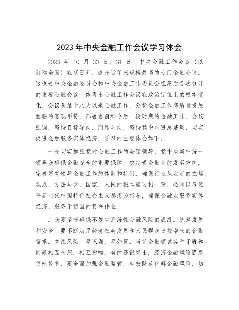 2023年中央金融工作会议学习体会2023年10月30日、31日,中央金融工作会议(以前称全国)在京召开。这是近年来规格最高的专门金融会议。这也是中央金融委员会和中央金融工作委员会组建后首次召开的重要金融会议,体现出金融工作会议在政治定位上的根本变化。会议总结十八大以来金融工作,分析金融工作高质量发展面临的客观形势,部署当前和今后一段时期的金融工作。会议强调,坚持目标导向、问题导向,坚持稳中求进总基调,切实促进金融服务实体经济。学习的主要体会如下:一是切实加强党对金融工作的全面领导。党中央集中统一领导是确保金融安全的重要保障,决定着金融业的发展方向。完善好党领导金融工作的体制和机制。确保行业从业者的立场、观点、方法与党、国家、人民的根本需要相一致。必须以习近平新时代中国特色社会主义思想为指导,确保金融业服务实体经济、服务于祖国的复兴伟业。二是要坚守确保不发生系统性金融风险的底线。统筹发展和安全,要不断满足经济社会发展和人民群众日益增长的金融需求。关注风险,早识别、早处置。当前金融领域各种矛盾和问题相互交织、相互影响,有的还很突出,经济金融风险隐患仍然较多。要全面加强金融监管,有效防范化解金融风险。切实提高金融监管有效性,依法将所有金融活动全部纳入监管,全面强化机构监管、行为监管、功能监管、持续监管,消除监管空白和盲区,严格执法、敢于亮剑,严厉打击非法金融活动,及时处置中小金融机构风险。三是加快金融供给侧改革。这是由党和国家的需要决定的,也是市场需求决定的。行业发展要服从这个前提。要促进金融服务科技创新、先进制造、绿色发展和中小微企业,大力支持实施创新和驱动发展战略、区域协调发展战略,积极促进科技金融、绿色金融、普惠金融、养老金融、数字金融发展。四是促进金融服务实体经济。完善现代金融企业制度,更好支持扩大内需。要解决金融服务实体经济质效不高的问题。打造现代金融机构和市场体系,疏通资金进入实体经济的渠道。五是全面加强金融监管。要解决金融监管和治理功能薄弱问题。消除监管空白点和盲区。没有监管和监管不到位都是要不得的。P2P很多问题的产生、发展都是因为监管不到位造成的。股市的规范,注册制的走深走实,发展多元化股权融资,提高上市公司质量,培育一流投行投资机构等都离不开全面加强监管。国家金融监督管理总局负责间接融资体系,对应非证券行业;证监会负责直接融资体系,对应证券行业。二级市场可能会迎来春天了。