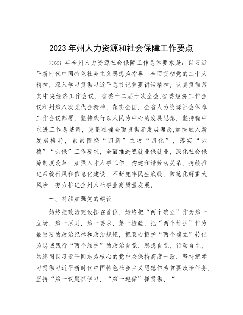 2023年州人力资源和社会保障工作要点2023年全州人力资源社会保障工作总体要求是:以习近平新时代中国特色社会主义思想为指导,全面贯彻党的二十大精神,深入学习贯彻习近平总书记重要讲话精神,认真贯彻落实中央经济工作会议,省委十二届十次全会,省委经济工作会议和州第八次党代会精神,落实全国、全省人力资源社会保障工作会议部署,坚持践行以人民为中心的发展思想,坚持稳中求进工作总基调,完整准确全面贯彻新发展理念,加快融入新发展格局,紧紧围绕“四新”主攻“四化”,落实“六稳”“六保”工作要求,全面推进稳就业保就业,深化社会保障制度改革,加强人才人事工作,构建和谐劳动关系,持续推进系统行风和信息化建设,不断兜牢民生底线,防范化解重大风险,努力推进全州人社事业高质量发展。一、持续加强党的建设始终把政治建设摆在首位,始终把“两个确立”作为第一立场、第一原则、第一要求、第一检验,把“两个维护”作为最重要的政治纪律和政治规矩,把衷心拥护“两个确立”转化为忠诚践行“两个维护”的政治自觉、思想自觉、行动自觉,始终同以习近平同志为核心的党中央保持高度一致。坚持把学习贯彻习近平新时代中国特色社会主义思想作为首要政治任务,坚持“第一议题抓学习、“第一遵循”抓贯彻、“第一政治要件”抓落实。深入学习习近平总书记视察*重要讲话精神,认真贯彻落实习近平总书记重要指示批示精神闭环管理工作细则,动态完善工作台账,定期开展“回头看”,不断提高政治判断力、政治领悟力、政治执行力。加强党的全面领导,落实全面从严治党主体责任和监督责任,主动把工作纳入党的集中统一领导。深入学习贯彻党的二十大、省委十二届十次全会和州第八次党代会精神,巩固拓展“牢记殷切嘱托、忠诚干净担当、喜迎建党百年”专题教育成果。严格执行民主集中制,落实“三重一大”集体研究制度,严格执行重大事项请示报告和个人事项报告制度。持续抓好模范机关、文明机关创建和巩固,加强基层党组织建设,积极发展党员,严肃党内政治生活,营造风清气正的良好政治生态。强化党对意识形态工作的领导,严格落实意识形态工作责任制。推进工青妇组织建设和关心下一代工作。健全完善机关党建制度规定,推进机关党的建设实现高质量发展。全面贯彻新时代党的组织路线,加强干部队伍建设,落实好干部标准,树立正确用人导向,激励保护干部担当作为。加强作风建设,推动“改进作风、狠抓落实”年见成效,力戒形式主义、官僚主义。加强纪律建设,深入推进党风廉政建设和反腐败工作,加强廉政风险防控,持续整治群众身边腐败和不正之风。二、防范化解各类风险