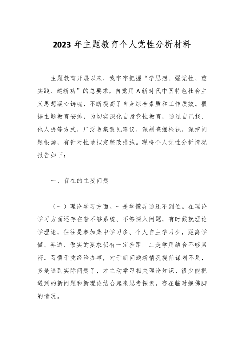 2023年主题教育个人党性分析材料主题教育开展以来,我牢牢把握“学思想、强党性、重实践、建新功”的总要求,自觉用A新时代中国特色社会主义思想凝心铸魂,不断提高了自身综合素质和工作质效。根据主题教育安排,为切实深化自身党性教育,通过自己找、他人提等方式,广泛收集意见建议,深刻查摆检视,深挖问题根源,有针对性地拟定整改措施。现将个人党性分析情况报告如下:一、存在的主要问题(一)理论学习方面。一是学懂弄通还不到位。在理论学习方面还存在着不够系统、不够深入问题,有时候就理论学理论,往往是参加集中学习多、个人自主学习少,距离学懂、弄通、做实的要求仍有一定差距。二是学用结合不够紧密。习惯于凭经验办事,对于新问题新情况提前谋划不足,多是遇到实际问题了,才主动学习相关理论知识,很少能把遇到的新问题和新理论结合起来思考探索,存在临时抱佛脚的情况。(二)政治素质方面。一是政治敏感性不够。从政治上观察问题、分析问题的敏锐性有待加强,对于有些工作的重要性认识不够,没有从政治大局的角度去考虑,有时听到不良言论没有以一个党员的身份去力所能及的进行抵制。二是党性锤炼不够自觉,对加强党性修养的重要性认识不足,对工作的思考深度、站位高度还不够。(三)能力本领方面。一是用党的创新理论提升思维能力还有差距。对党的创新理论学的不深不透,存在本领恐慌,在应对新问题时还没有必胜的信心,应对急难险重任务的能力仍需提升。二是工作的主动性还有差距。工作时找不到好的思路方法,就存在拖一拖、放一放的思想,没有主动积极协调解决,导致工作推动缓慢、成效不明显。三是破解难题的能力本领有待提升。存在惰性思维,总是等待领导的安排布置,没有立足实际谋划工作,在创新性开展工作上缺乏好的思路和方法。