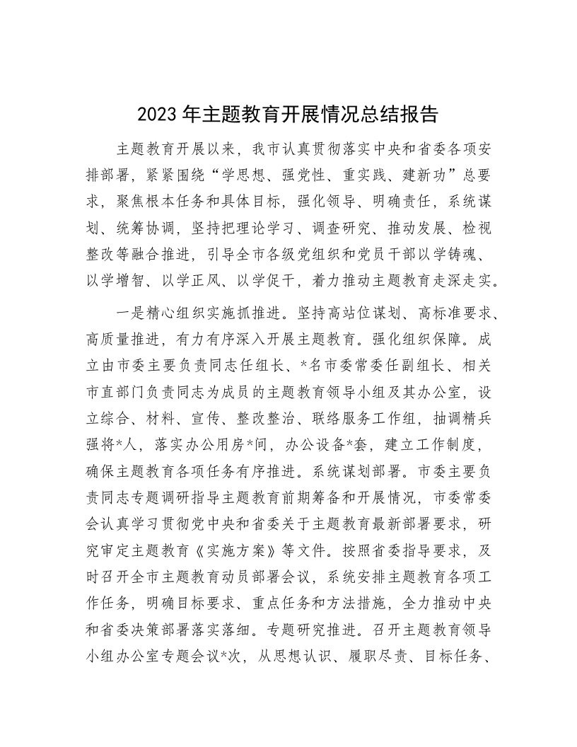 2023年主题教育开展情况总结报告主题教育开展以来,我市认真贯彻落实中央和省委各项安排部署,紧紧围绕“学思想、强党性、重实践、建新功”总要求,聚焦根本任务和具体目标,强化领导、明确责任,系统谋划、统筹协调,坚持把理论学习、调查研究、推动发展、检视整改等融合推进,引导全市各级党组织和党员干部以学铸魂、以学增智、以学正风、以学促干,着力推动主题教育走深走实。一是精心组织实施抓推进。坚持高站位谋划、高标准要求、高质量推进,有力有序深入开展主题教育。强化组织保障。成立由市委主要负责同志任组长、*名市委常委任副组长、相关市直部门负责同志为成员的主题教育领导小组及其办公室,设立综合、材料、宣传、整改整治、联络服务工作组,抽调精兵强将*人,落实办公用房*间,办公设备*套,建立工作制度,确保主题教育各项任务有序推进。系统谋划部署。市委主要负责同志专题调研指导主题教育前期筹备和开展情况,市委常委会认真学习贯彻党中央和省委关于主题教育最新部署要求,研究审定主题教育《实施方案》等文件。按照省委指导要求,及时召开全市主题教育动员部署会议,系统安排主题教育各项工作任务,明确目标要求、重点任务和方法措施,全力推动中央和省委决策部署落实落细。专题研究推进。召开主题教育领导小组办公室专题会议*次,从思想认识、履职尽责、目标任务、自身建设等方面,明确职责要求,压实工作责任,推动任务落实。由市委主要负责同志主持召开专题会议,对防止形式主义和“低级红”“高级黑”情况进行安排部署,确保主题教育沿着正确方向推进。二是强化理论武装抓学习。坚持把学习贯彻思想作为首要任务,引导组织广大党员干部读原著、学原文、悟原理,不断增进对党的创新理论的政治认同、思想认同、理论认同、情感认同。领导带动学。定期召开市委理论学习中心组学习会议,制定印发《市委常委会主题教育读书班方案》,从*月*日至*日举办为期一周的读书班,采取集中学习、专题辅导、研讨交流、观看专题片、革命传统教育、个人自学等方式,市级领导干部带头学习领会思想的科学体系、核心要义、实践要求,为全市广大党员干部作出了表率。专题辅导学。坚持把专题辅导作为提升学习实效的重要抓手,市委、市政府主要负责同志在读书班向党员干部作专题辅导报告*次,邀请市委党校教授辅导和观看专题辅导视频*次,市级领导干部开展交流研讨*次,制定主题教育专题党课计划,市级领导向包抓乡镇、分管领域党员干部讲党课,推动理论学习入脑入心。集中联动学。严格落实理论学习“第一议题”制度,深化“五学联动”机制,通过党员大会、支委会、党小组会开展学习讨论,组织党员交流学习体会、相互启发提高。至目前,基层党组织集中学习共*次,发放《关于调查研究论述摘编》*本。因人施教学。对流