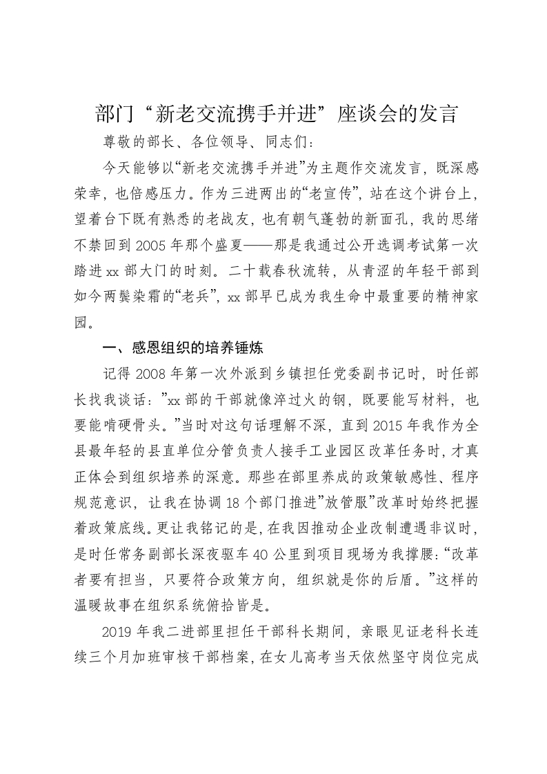 部门“新老交流携手并进”座谈会的发言尊敬的部长、各位领导、同志们:今天能够以“新老交流携手并进”为主题作交流发言,既深感荣幸,也倍感压力。作为三进两出的“老宣传”,站在这个讲台上,望着台下既有熟悉的老战友,也有朝气蓬勃的新面孔,我的思绪不禁回到2005年那个盛夏一那是我通过公开选调考试第一次踏进xx部大门的时刻。二十载春秋流转,从青涩的年轻干部到如今两鬓染霜的“老兵”,燃部早已成为我生命中最重要的精神家园。一、感恩组织的培养锤炼记得2008年第一次外派到乡镇担任党委副书记时,时任部长找我谈话:”xx部的干部就像淬过火的钢,既要能写材料,也要能啃硬骨头。”当时对这句话理解不深,直到2015年我作为全县最年轻的县直单位分管负责人接手工业园区改革任务时,才真正体会到组织培养的深意。那些在部里养成的政策敏感性、程序规范意识,让我在协调18个部门推进”放管服”改革时始终把握着政策底线。更让我铭记的是,在我因推动企业改制遭遇非议时,是时任常务副部长深夜驱车40公里到项目现场为我撑腰:“改革者要有担当,只要符合政策方向,组织就是你的后盾。”这样的温暖故事在组织系统俯拾皆是。2019年我二进部里担任干部科长期间,亲眼见证老科长连续三个月加班审核干部档案,在女儿高考当天依然坚守岗位完成换届考察材料;目睹研究室主任带着心脏支架在党代会筹备期间通宵达旦修改报告;更难忘去年疫情最吃紧时,全体双干部下沉社区组建临时党支部的冲锋场景。正是这些点点滴滴,铸就了xx干部“讲政治、重公道、业务精、作风好”的金字招牌。二、感悟xx部的三重属性(一)作为“学校”的育人维度如果说党性教育是这所学校的必修课,那么燃部的教学方式堪称沉浸式教育。每周四晚上的“xx讲堂”雷打不动,从“三会一课”制度沿革到干部选拔任用条例解读,老处长们用三十年工作经验提炼的“政策要决”比任何教材都鲜活。让我记忆犹新的是2017年干部监督专项检查中,分管领导带着我们逐字推敲考察材料,仅“政治表现”部分就修改七稿,他说:“x双文字差之毫厘,干部命运可能谬以千里。”这所学校最独特的育人方式在于环境浸润。记得初到部里时,看到分管副部长办公室常年亮到深夜的灯光,听到老同志对“干部人事档案分类标准”如数家珍,感受到同事间切磋业务时的较真劲儿,这种氛围比任何说教都更具感染力。在这里,我学会了用政策标尺丈量工作,用程序规范约束行为,用燃情怀滋养初心。(二)作为“熔炉”的锻造价值燃工作的特殊性决定了这个熔炉的温度和精度。干部考察时的“五必谈”要求,换届选举中的“九个严禁”,发展党员时的“二十