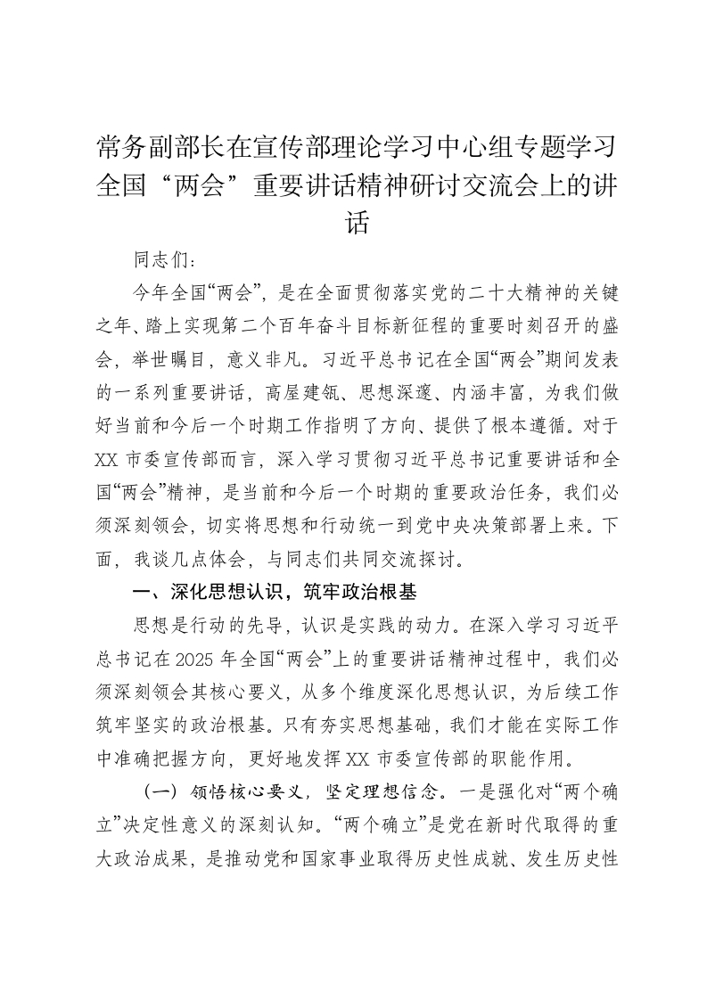 常务副部长在宣传部理论学习中心组专题学习全国“两会”重要讲话精神研讨交流会上的讲话同志们:今年全国“两会”,是在全面贯彻落实党的二十大精神的关键之年、踏上实现第二个百年奋斗目标新征程的重要时刻召开的盛会,举世瞩目,意义非凡。习近平总书记在全国“两会”期间发表的一系列重要讲话,高屋建瓴、思想深邃、内涵丰富,为我们做好当前和今后一个时期工作指明了方向、提供了根本遵循。对于X市委宣传部而言,深入学习贯彻习近平总书记重要讲话和全国“两会”精神,是当前和今后一个时期的重要政治任务,我们必须深刻领会,切实将思想和行动统一到党中央决策部署上来。下面,我谈几点体会,与同志们共同交流探讨。一、深化思想认识,筑牢政治根基思想是行动的先导,认识是实践的动力。在深入学习习近平总书记在2025年全国“两会”上的重要讲话精神过程中,我们必须深刻领会其核心要义,从多个维度深化思想认识,为后续工作筑牢坚实的政治根基。只有夯实思想基础,我们才能在实际工作中准确把握方向,更好地发挥X市委宣传部的职能作用。(一)领悟核心要义,坚定理想信念。一是强化对“两个确立”决定性意义的深刻认知。“两个确立”是党在新时代取得的重大政治成果,是推动党和国家事业取得历史性成就、发生历史性变革的决定性因素。从历史发展进程来看,每当重大历史关头,坚强的领导核心和科学的理论指引总能带领我们突破困境、走向胜利。党的十八大以来,以习近平同志为核心的党中央团结带领全党全国各族人民,攻克诸多长期未解决的难题,办成许多事关长远的大事要事,推动党和国家事业取得举世瞩目的重大成就。我们要深刻领悟“两个确立”的决定性意义,将其转化为坚决做到“两个维护”的实际行动,不断增强“四个意识”、坚定“四个自信”,始终在思想上、政治上、行动上同以习近平同志为核心的党中央保持高度一致。在宣传工作中,我们要积极传播“两个确立”的重要意义,引导广大干部群众坚定不移听党话、跟党走。二是深入理解习近平新时代中国特色社会主义思想的丰富内涵。习近平新时代中国特色社会主义思想是当代中国马克思主义、二十一世纪马克思主义,是中华文化和中国精神的时代精华。我们要全面系统学习这一思想,深入领会其核心要义、精神实质、丰富内涵和实践要求。这一思想涵盖了改革发展稳定、内政外交国防、治党治国治军等各个领域,为我们提供了强大的思想武器和行动指南。我们要将其贯穿于宣传工作的全过程,通过各种宣传形式和渠道,让这一思想深入人心,凝聚起全市人民团结奋斗的强大精神力量。无论是组织理论学习、开展舆论宣传,还是推动文化建设,都要以习近平新时代中国特色社会主义思想为指导,确保宣传工作的正确方向。三是准确把握高质量发展的深刻内涵和重要意义。高质量发展是全面建设社会主义现代化国家的首要任务。