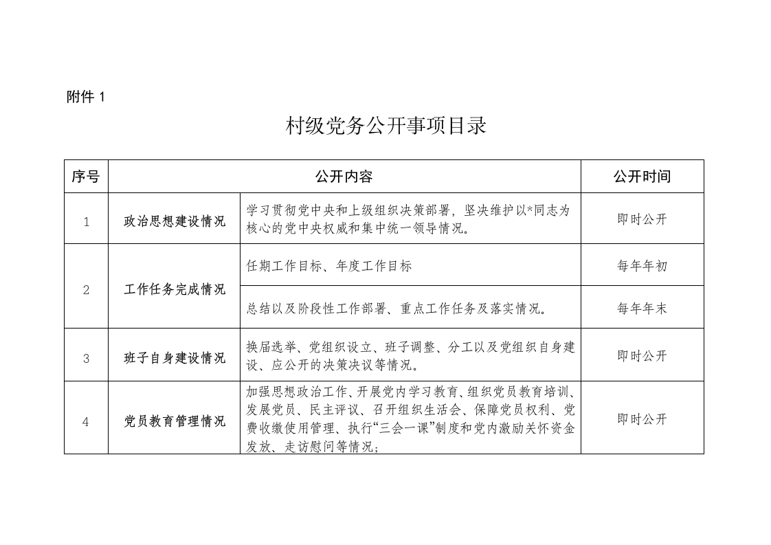 附件1村级党务公开事项目录序号公开内容公开时间学习贯彻党中央和上级组织决策部署,坚决维护以*同志为政治思想建设情况核心的党中央权威和集中统一领导情况。即时公开任期工作目标、年度工作目标每年年初2工作任务完成情况总结以及阶段性工作部署、重点工作任务及落实情况。每年年末换届选举、党组织设立、班子调整、分工以及党组织自身建3班子自身建设情况即时公开设、应公开的决策决议等情况。加强思想政治工作、开展党内学习教育、组织党员教育培训、发展党员、民主评议、召开组织生活会、保障党员权利、党4党员教育管理情况费收缴使用管理、执行“三会一课”制度和党内激励关怀资金即时公开发放、走访慰问等情况;5党员教育管理情况党内评先评优推荐、表彰、奖惩、关爱救助等情况。即时公开防止和纠正“四风”现象,联系服务党员和群众情况;6党风作风建设情况即时公开落实管党治党政治责任,加强党风廉政建设,对党员作出组织处理和纪律处分情况。村“两委”后备力量确定、培养、使用;长期公开7其他应当公开的党务党员活动经费使用;每季度公开一次解决办理群众意见建议、需求诉求、实事好事等情况。即时公开