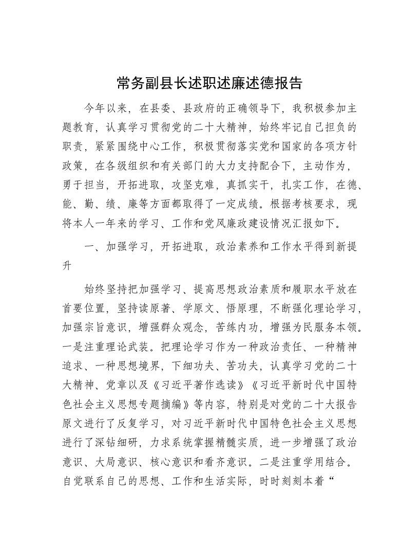 常务副县长述职述廉述德报告今年以来,在县委、县政府的正确领导下,我积极参加主题教育,认真学习贯彻党的二十大精神,始终牢记自己担负的职责,紧紧围绕中心工作,积极贯彻落实党和国家的各项方针政策,在各级组织和有关部门的大力支持配合下,主动作为,勇于担当,开拓进取,攻坚克难,真抓实干,扎实工作,在德能、勤、绩、廉等方面都取得了一定成绩。根据考核要求,现将本人一年来的学习、工作和党风廉政建设情况汇报如下。一、加强学习,开拓进取,政治素养和工作水平得到新提升始终坚持把加强学习、提高思想政治素质和履职水平放在首要位置,坚持读原著、学原文、悟原理,不断强化理论学习,加强宗旨意识,增强群众观念,苦练内功,增强为民服务本领。一是注重理论武装。把理论学习作为一种政治责任、一种精神追求、一种思想境界,下细功夫、苦功夫,认真学习党的二十大精神、党章以及《习近平著作选读》《习近平新时代中国特色社会主义思想专题摘编》等内容,特别是对党的二十大报告原文进行了反复学习,对习近平新时代中国特色社会主义思想进行了深钻细研,力求系统掌握精髓实质,进一步增强了政治意识、大局意识、核心意识和看齐意识。二是注重学用结合。自觉联系自己的思想、工作和生活实际,时时刻刻本着“发现问题、解决问题、提升能力”的原则,对照自身存在的差距、不足,深刻剖析,自我反省,有针对性地开展学习实践,不断提升自我党性修养。同时,将学习教育与岗位履职、工作落实等紧密结合,认真学习经济、项目、财经、人事、公安、招商引资、税收、信访司法等知识,真正做到两手抓、两不误、两促进。三是注重调查研究。重点围绕政府职能转变、财税体制改革、重大项目建设、招商引资、商贸物流、民生保障等涉及长远发展的重点问题开展经常性调研,着力提升新常态、新形势下驾驭经济发展的能力和水平。结合学习贯彻党的二十大精神,深入学习领会习近平新时代中国特色社会主义思想,对项目建设和招商引资、加快重点民生工程建设推进社会事业发展等重大问题,带领分管部门到乡镇、社区和企业进行了专题调研,提出针对性措施,为县委、县政府决策部署提供了有效依据。二、抓主抓重,攻坚克难,力促重点工作实现新突破充分发扬“5+2”、“白+黑”、“人一之、我十之”的敬业精神,紧紧围绕全县工作大局,坚持把推动分管领域发展作为第一要务,聚焦中心,创新举措,高效务实推进各项工作开展,努力为肃州经济社会发展贡献自己的力量。1.突出增强后劲抓投资,重点项目建设有序推进。积极应对风电项目暂停、光电项目受限、金融贷款困难、手续办理繁杂等诸多不利因素,牢固树立“