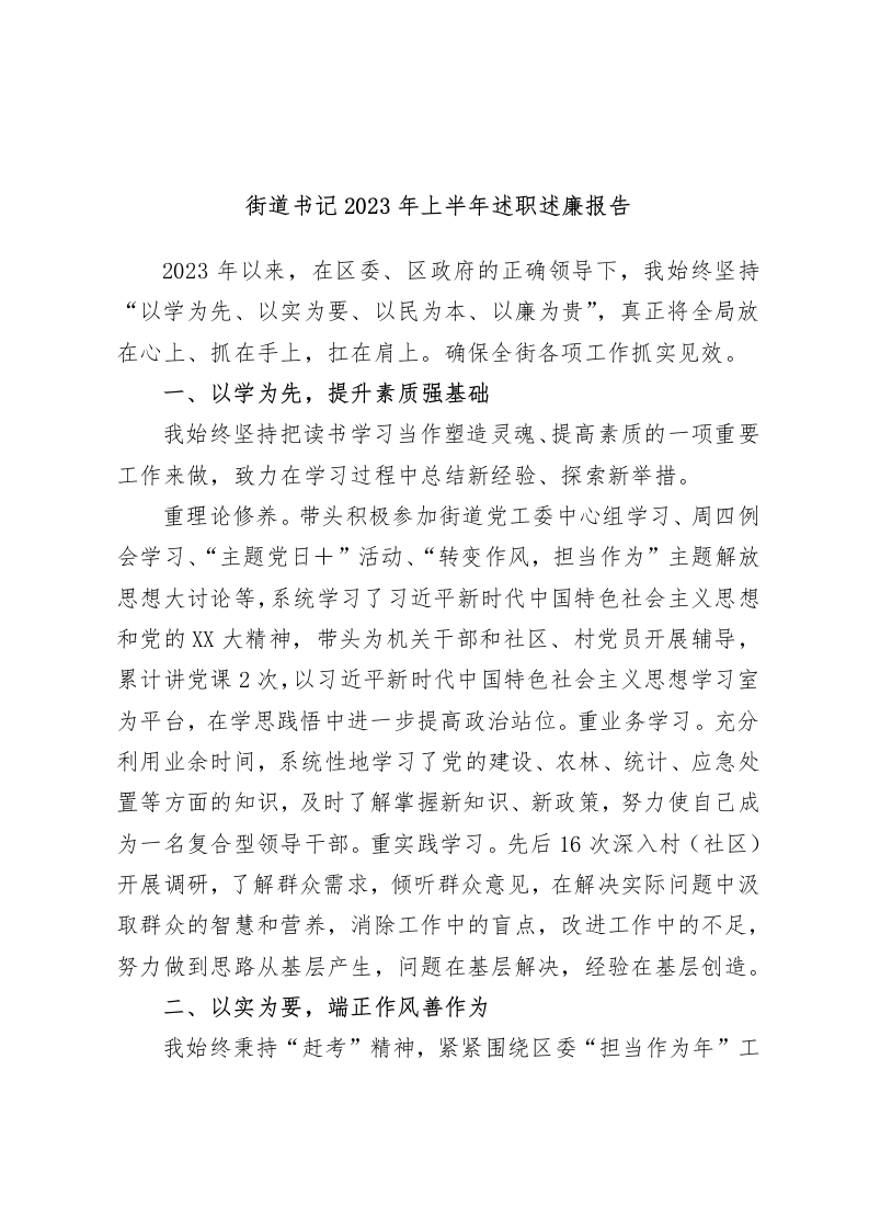 街道书记2023年上半年述职述廉报告2023年以来,在区委、区政府的正确领导下,我始终坚持“以学为先、以实为要、以民为本、以廉为贵”,真正将全局放在心上、抓在手上,扛在肩上。确保全街各项工作抓实见效。一、以学为先,提升素质强基础我始终坚持把读书学习当作塑造灵魂、提高素质的一项重要工作来做,致力在学习过程中总结新经验、探索新举措。重理论修养。带头积极参加街道党工委中心组学习、周四例会学习、“主题党日十”活动、“转变作风,担当作为”主题解放思想大讨论等,系统学习了习近平新时代中国特色社会主义思想和党的XX大精神,带头为机关干部和社区、村党员开展辅导,累计讲党课2次,以习近平新时代中国特色社会主义思想学习室为平台,在学思践悟中进一步提高政治站位。重业务学习。充分利用业余时间,系统性地学习了党的建设、农林、统计、应急处置等方面的知识,及时了解掌握新知识、新政策,努力使自己成为一名复合型领导干部。重实践学习。先后16次深入村(社区)开展调研,了解群众需求,倾听群众意见,在解决实际问题中汲取群众的智慧和营养,消除工作中的盲点,改进工作中的不足,努力做到思路从基层产生,问题在基层解决,经验在基层创造。二、以实为要,端正作风善作为我始终秉持“赶考”精神,紧紧围绕区委“担当作为年”工作部署和“三抓三强”总要求,以“作风建设年”活动为契机,以“大干60天,开创新局面,实现双过半”为目标,带领班子成员充分发扬“实于细干巧干”的工作作风,高质高效推进工作落实。善谋为重抓全局。创新“1十5”工作思路,紧盯基层党建提升1项工程和产业发展行动、基础建设行动、民生服务行动、生态修复行动、社会治理行动项目建设5大行动32项重点任务,扎实推进全街工作干出实效。党建引领强抓手。全力推进区委“五化五强”党组织建设任务,实施基层工作“党建十”引领工程,着力构建“街道党工委一社区党组织一辖区企事业单位、居民小区一楼栋、企业车间”的基层党建网格化治理模式,把全面建成小康社会项目建设、河长制、城市管理、计划生育、信访稳定、综合治理、安全生产等重点工作融入其中,全面构建“党建十基层治理”工作体系,突出政治功能,压实责任担当。作风建设除积弊。持续深化“三纠三促”“治转提”专项行动成效,研究制定《XXX街道深入开展“转变作风改善发展环境建设年”活动工作方案》,成立了以我为组长的活动领导小组,以“五抓五促五到位”为抓手,带头深入村社、辖区企业等,主动征求广大群众和各方面对我的意见建议10余条,通过班子引领查、点帮结合查、开门纳谏查、履责督办查的“四查”举措,查摆出本人作风方面存在的积弊陋习4大类10个。坚持问题导向,坚持抓细落小,认真制定本人整改台账,对班子及班子成员的问题清单和整改台账做到亲自审核把关,亲自跟踪问效。协调推进聚合力。全