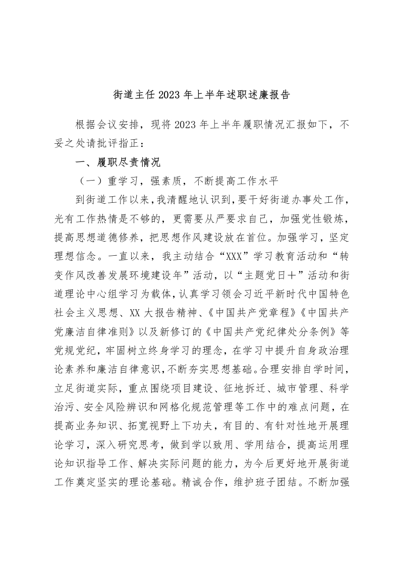 街道主任2023年上半年述职述廉报告根据会议安排,现将2023年上半年履职情况汇报如下,不妥之处请批评指正:一、履职尽责情况(一)重学习,强素质,不断提高工作水平到街道工作以来,我清醒地认识到,要干好街道办事处工作,光有工作热情是不够的,更需要从严要求自己,加强党性锻炼,提高思想道德修养,把思想作风建设放在首位。加强学习,坚定理想信念。一直以来,我主动结合“XXX”学习教育活动和“转变作风改善发展环境建设年”活动,以“主题党日十”活动和街道理论中心组学习为载体,认真学习领会习近平新时代中国特色社会主义思想、XX大报告精神、《中国共产党章程》《中国共产党廉洁自律准则》以及新修订的《中国共产党纪律处分条例》等党规党纪,牢固树立终身学习的理念,在学习中提升自身政治理论素养和廉洁自律意识,不断夯实思想基础。合理安排自学时间,立足街道实际,重点围绕项目建设、征地拆迁、城市管理、科学治污、安全风险辨识和网格化规范管理等工作中的难点问题,在提高业务知识、拓宽视野上下功夫,有目的、有针对性地开展理论学习,深入研究思考,做到学以致用、学用结合,提高运用理论知识指导工作、解决实际问题的能力,为今后更好地开展街道工作奠定坚实的理论基础。精诚合作,维护班子团结。不断加强党性锻炼和党性修养,执行党组织的各项决定,自觉做到在政治上、思想上、行动上与街道党工委保持一致。把守纪律讲规矩摆在突出位置,在事关方向和原则的问题上立场坚定,能顾全大局,搞好协调配合,平时工作中,注重维护班子团结,从提高班子战斗力、凝聚力出发,树立班子整体形象。改进作风,提高工作效率。作为一名领导干部来说,既要干净、又要干事,并且要多干群众欢迎的实事、好事,否则就不是一位称职的领导干部。我是这样想也是努力这样去做的。始终坚持把群众的意愿和需求作为工作的出发点和落脚点;始终坚持全身心投入工作,遇到突发事件处理、重要工作等,保持旺盛的工作热情,努力把工作做实做精做细;始终坚持一切从街道实际出发,求真务实,力求高效,做到知实情、讲实话、办实事、求实效。(二)重实绩,尽职责,努力推进各项工作一是紧扣项目建设,确保经济建设健康稳步运行。牢固树立项目建设全区一盘棋的思想,秉承服务企业、服务群众、服务社会的工作理念,按照“大抓项目强发展”的要求,聚焦“四个一批”,不断巩固和深化“千企万商大走访活动”成果,认真谋划研究,精心安排部署,今年谋划储备、开工建设、集中办理、竣工投运项目共19个。项目建设全面加快。经济指标提速增收。征地拆迁稳步推进。二是紧扣民计民生,推进社会事业全面