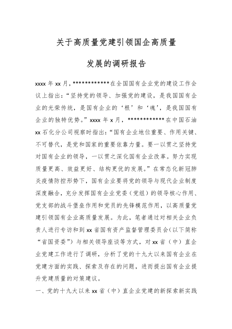 关于高质量党建引领国企高质量发展的调研报告XXXX年XX月,******在全国国有企业党的建设工作会议上指出:“坚持党的领导、加强党的建设,是我国国有企业的光荣传统,是国有企业的‘根’和‘魂’,是我国国有企业的独特优势。”XXXX年X月,******在中国石油xx石化分公司视察时指出:“国有企业地位重要、作用关键、不可替代,是党和国家的重要依靠力量。要一以贯之坚持党对国有企业的领导,一以贯之深化国有企业改革。努力实现质量更高、效益更好、结构更优的发展。”在常态化新冠肺炎疫情防控形势下,国有企业要将党的领导与现代企业制度深度融合,充分发挥国有企业党委(党组)的领导核心作用、党支部的战斗堡垒作用和党员的先锋模范作用,以高质量党建引领国有企业高质量发展。为此,笔者通过对相关企业负责人进行专访和到x省国有资产监督管理委员会(以下简称“省国资委”)与相关领导座谈等方式,对xx省(中)直企业党建工作进行了调研,分析了党的十九大以来国有企业在党建方面的实践、探索及存在的问题,进而提出国有企业提升党建质量的对策建议。一、党的十九大以来x省(中)直企业党建的新探索新实践加强国企党建是x省委省政府加强基层党建工作的重要内容之一,同时更是省(中)直企业要抓好的重要工作。近年来,xx省委省政府高度重视并积极部署,省(中)直企业党委(党组)对党建工作具体领导并高位推动,国企党建工作取得了显著的成效,主要表现为四个方面。(一)强化顶层设计,为国企党建出谋划策xxxx年xx月xx日,x省委办公厅印发了《关于认真学习贯彻〈中国***支部工作条例(试行)》的通知》,省委将xXx年确定为“全省党支部建设质量提升年”。为了进一步推进基层党建工作,xxx年x月,省委组织部印发通知,将xxx年确定为“全省基层党建制度落实年”,未来将继续巩固基层党建质量建设成果。省国资委党委早在xxxx年就印发了关于加强国有企业党建工作的相关文件,制定了“xx”抓基层党建的工作思当前隐藏内容免费查看路:通过《关于印发(省属国有企业基层党建重点任务三年工作规划(xxxx一xxxx年)》的通知》制定“一个规划”,通过《关于印发〈关于省(中)直企业基层党组织“固元铸魂工程”“固本强基工程”的实施意见〉的通知》明确“两个工程”,通过《关于印发〈关于省(中)直企业开展“强党建、兴国企、为xx振兴发展做贡献”行动的实施意见〉的通知》开展“一个行动”。xXx年,省委组织部和省国资委联合印发了《关于强化国有企业党委领导作用,建立“三议一报告一执行”决策