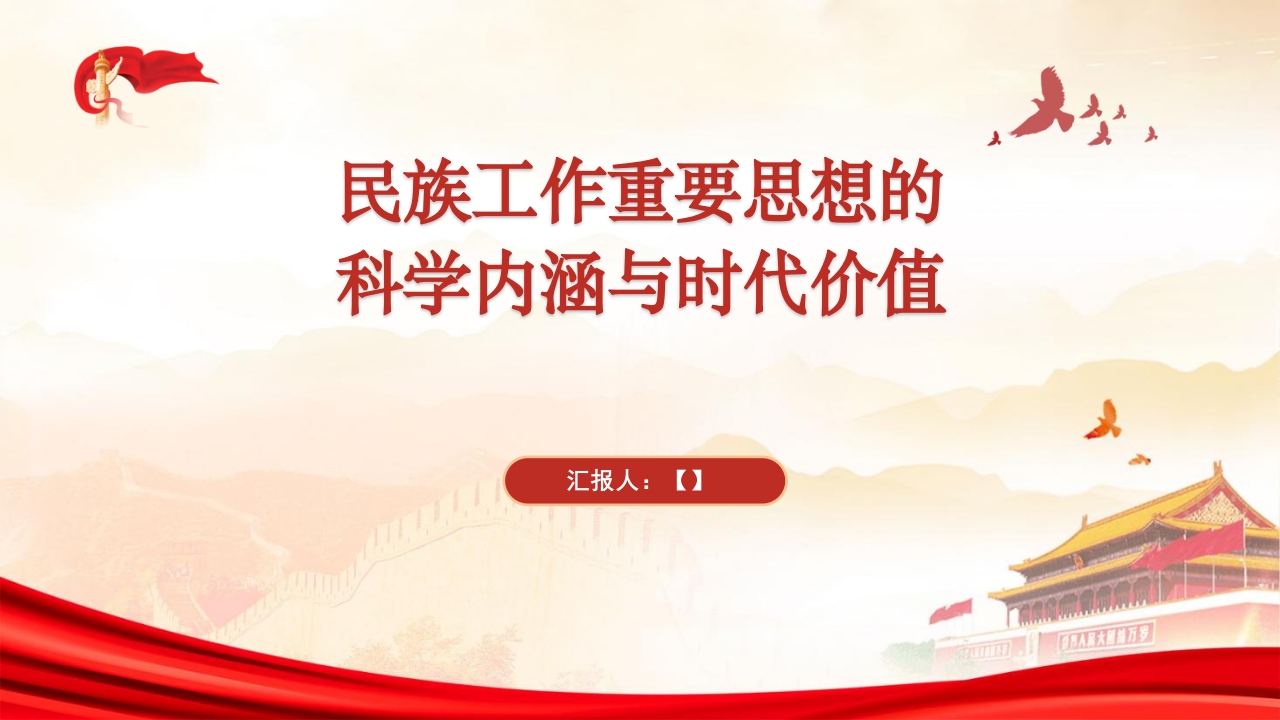民族工作重要思想的科学内涵与时代价值汇报人:【】前言习近平总书记在党的二十大报告中指出:“以铸牢中华民族共同体意识为主线,坚定不移走中国特色解决民族问题的正确道路,坚持和完善民族区域自治制度,加强和改进党的民族工作,全面推进民族团结进步事业。”这是党的二十大关于巩固和发展最广泛的爱国统一战线的重要战略部署。党的二十届三中全会强调“制定民族团结进步促进法,健全铸牢中华民族共同体意识制度机制,增强中华民族凝聚力”,对加强和改进党的民族工作提出了新的要求。贯彻落实中央关于加强和改进民族工作的决策部署,切实做好新形势下民族工作,团结全国各族人民凝心聚力推进强国建设和民族复兴伟业,必须深入研究习近平总书记关于加强和改进民族工作的重要思想,深刻认识其形成的逻辑理路,系统阐明其理论建构与鲜明特色,准确把握其贯彻落实的理论价值和现实意义。